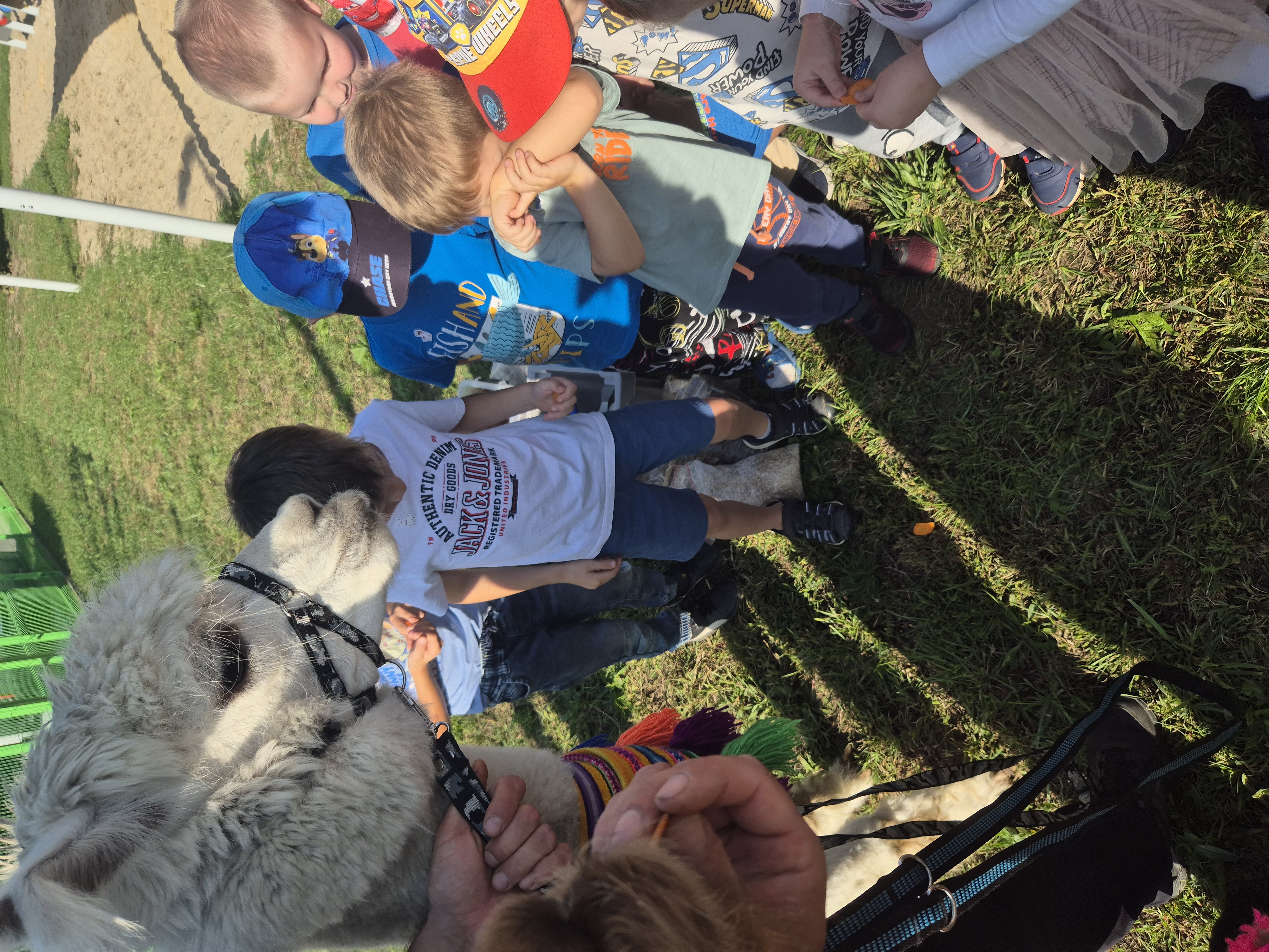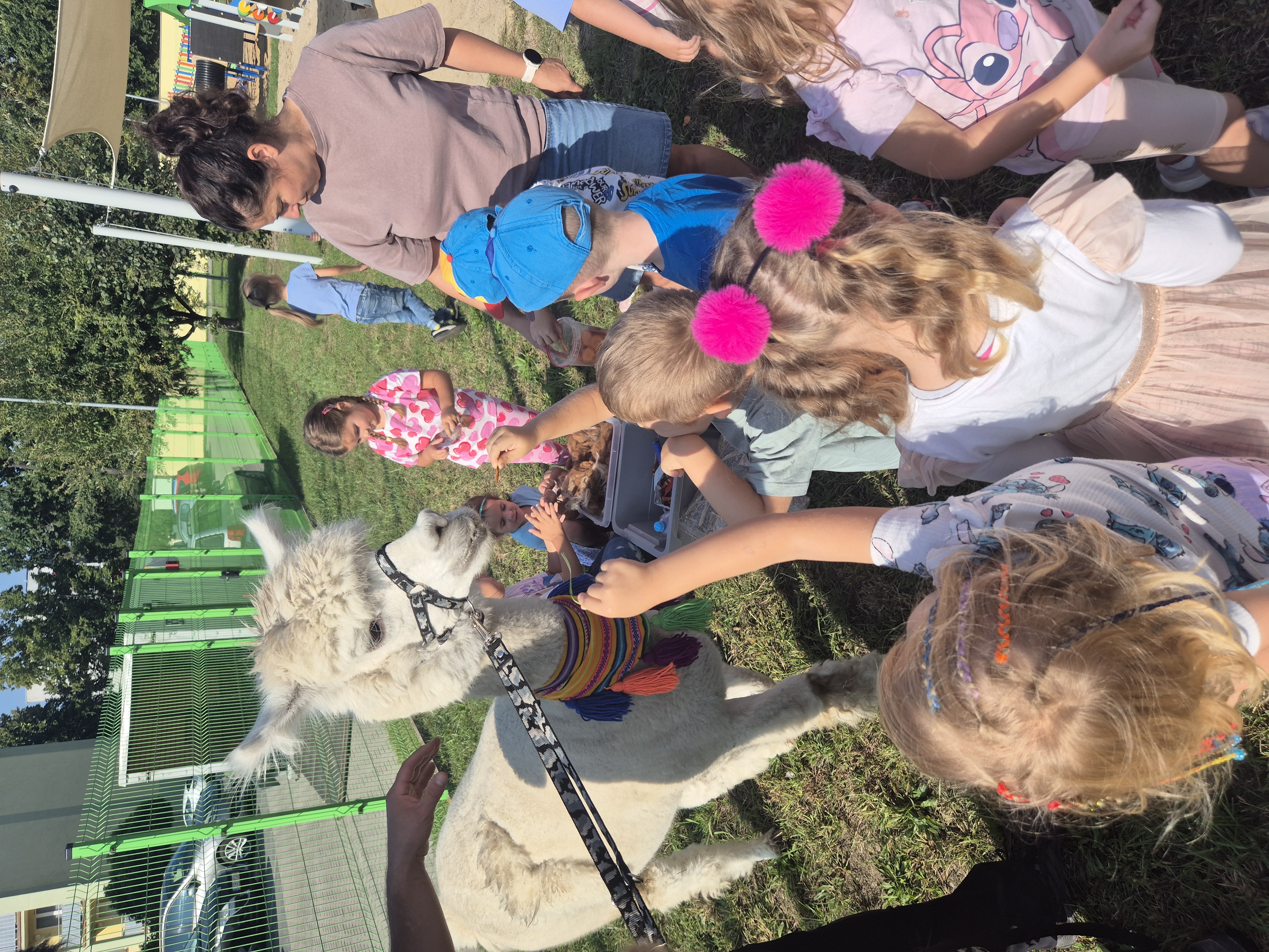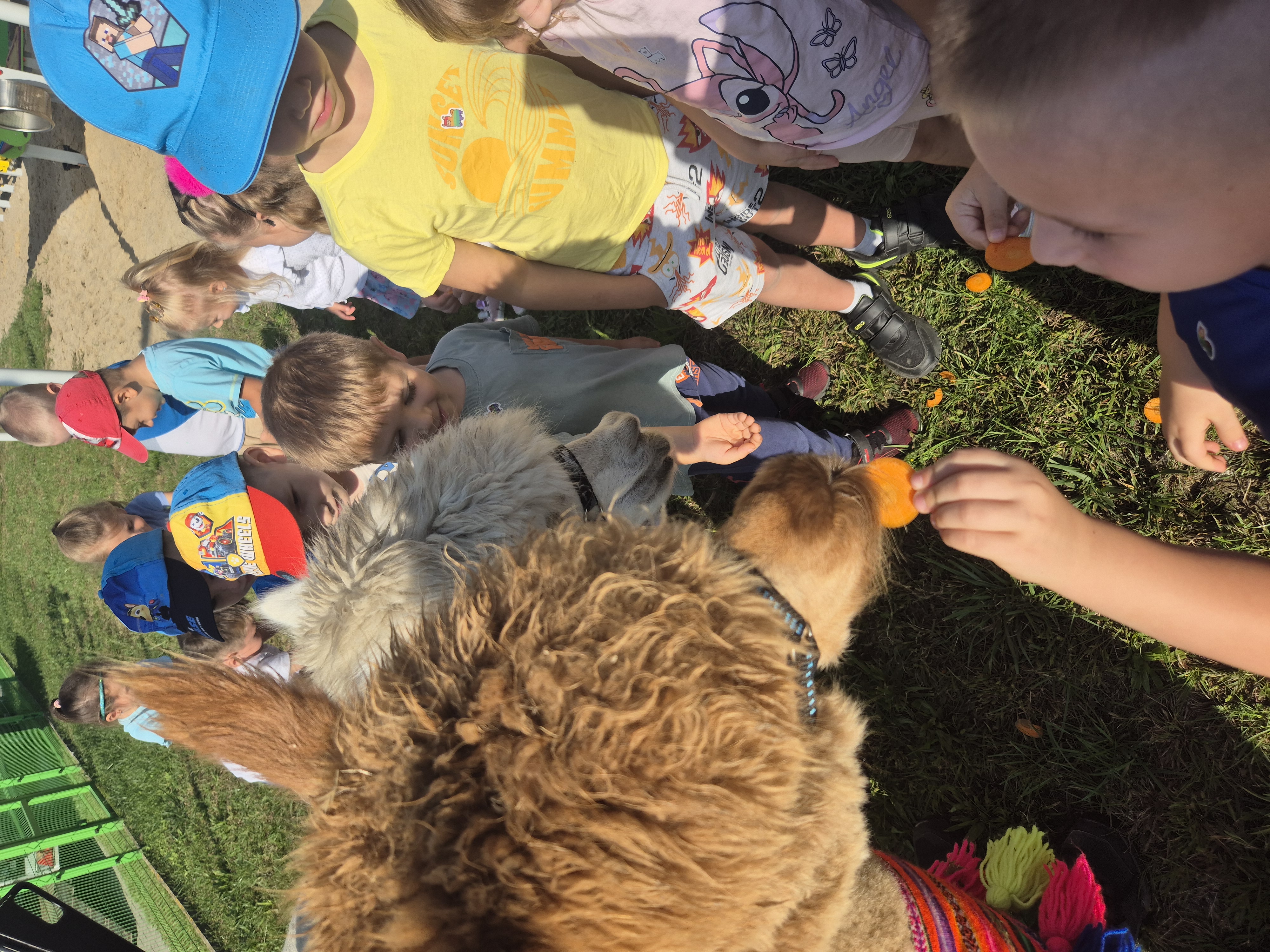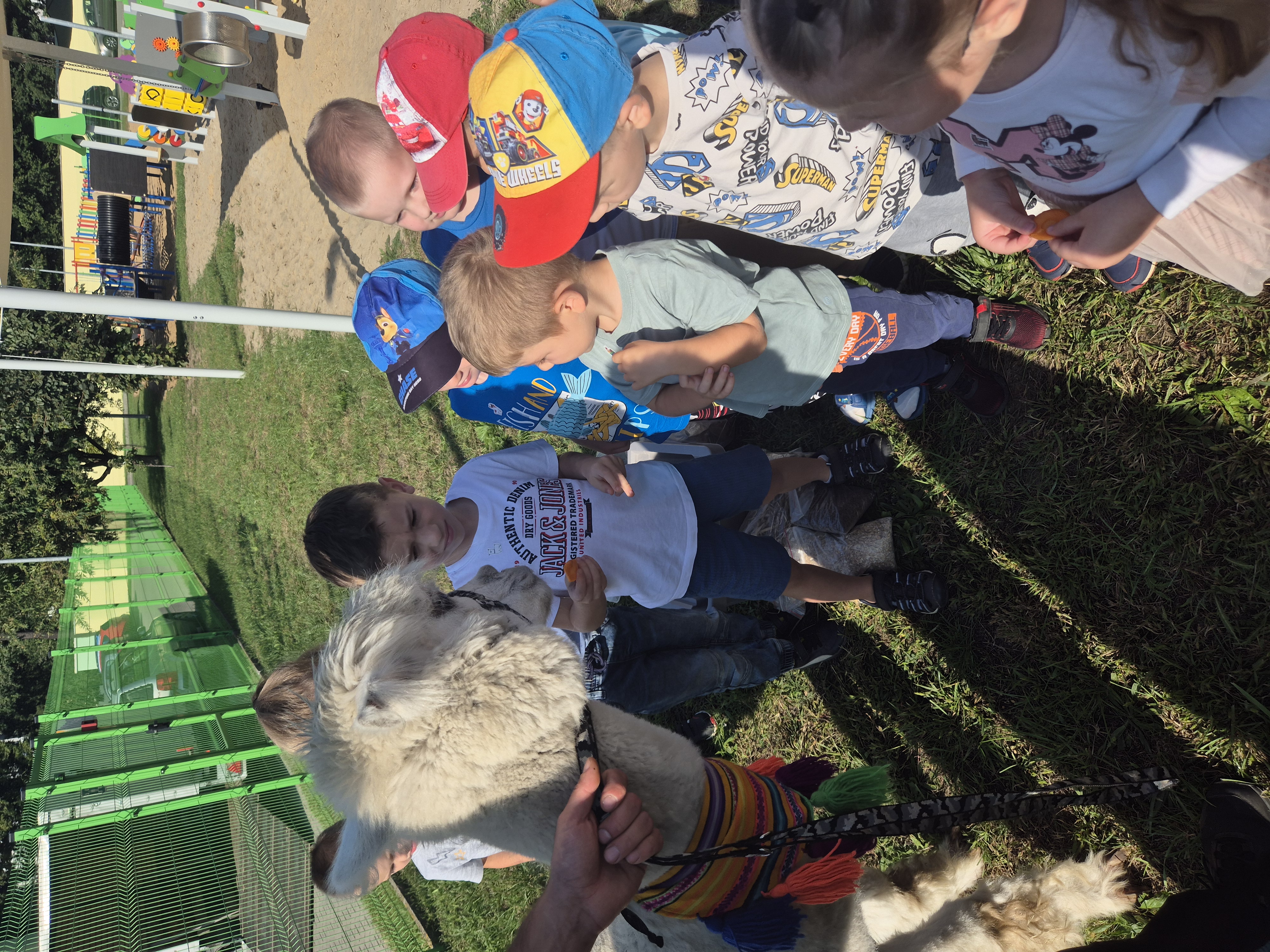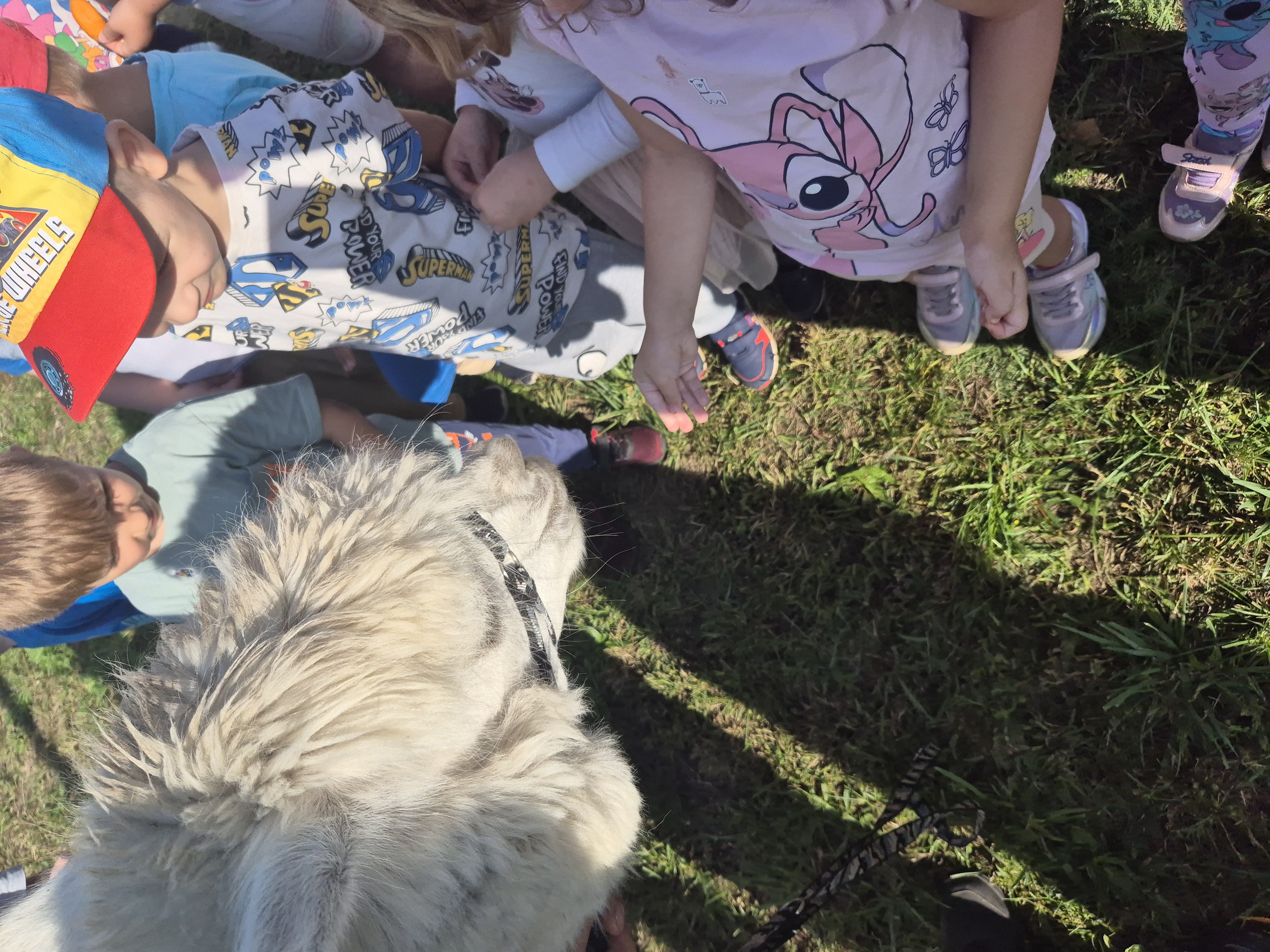 10 września nasze przedszkole odwiedziły alpaki. Alpaki, to zwierzęta o bardzo łagodnym usposobieniu. Są płochliwe i delikatne, zupełnie pozbawione agresji. Szczególnie pozytywnie nastawione są do dzieci. Głaskanie i przytulanie alpak pomaga dzieciom rozluźnić się i otworzyć. Wszystkie przedszkolaki były zachwycone ich wizytą. Śnieżek i Leoś to cudowne alpaki. Spotkanie z nimi było bardzo ciekawą lekcją edukacyjną, podczas której przedszkolaki poznały życie i zwyczaje tych przemiłych zwierząt. Dzieci wysłuchały wielu ciekawostek o alpakach. Każdy miał możliwość nakarmienia zwierzątka jego ulubionym przysmakiem – marchewką.