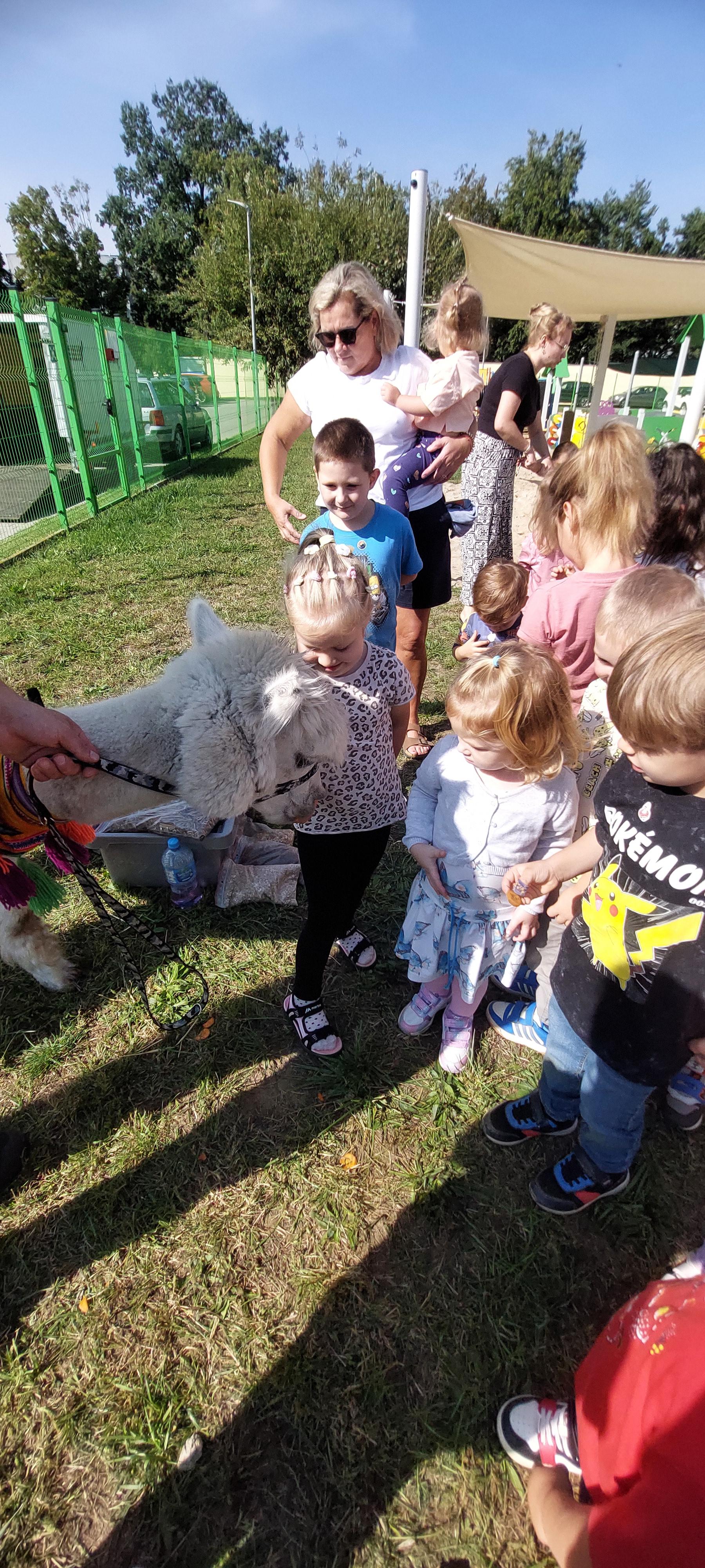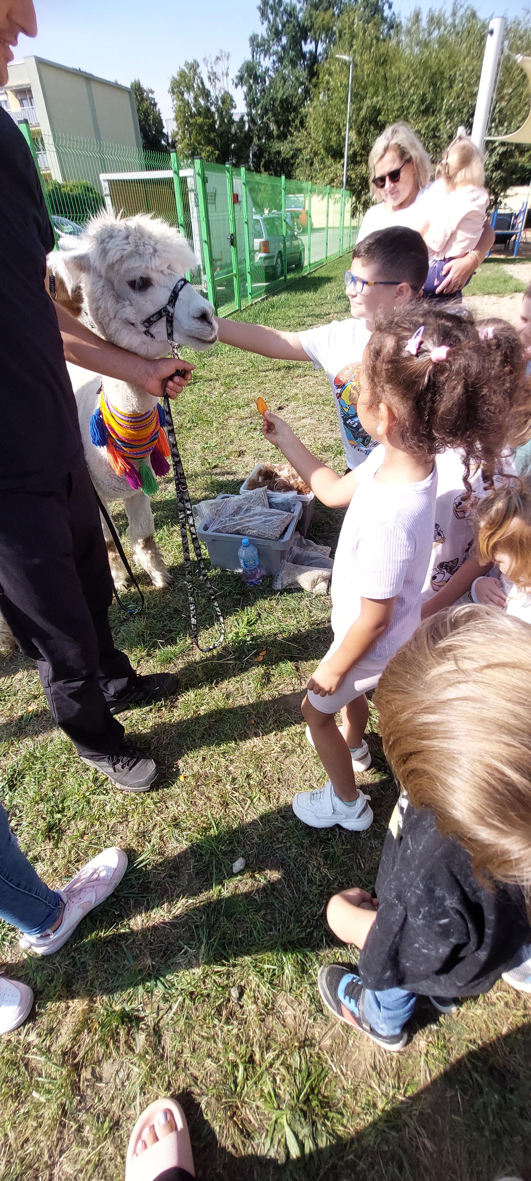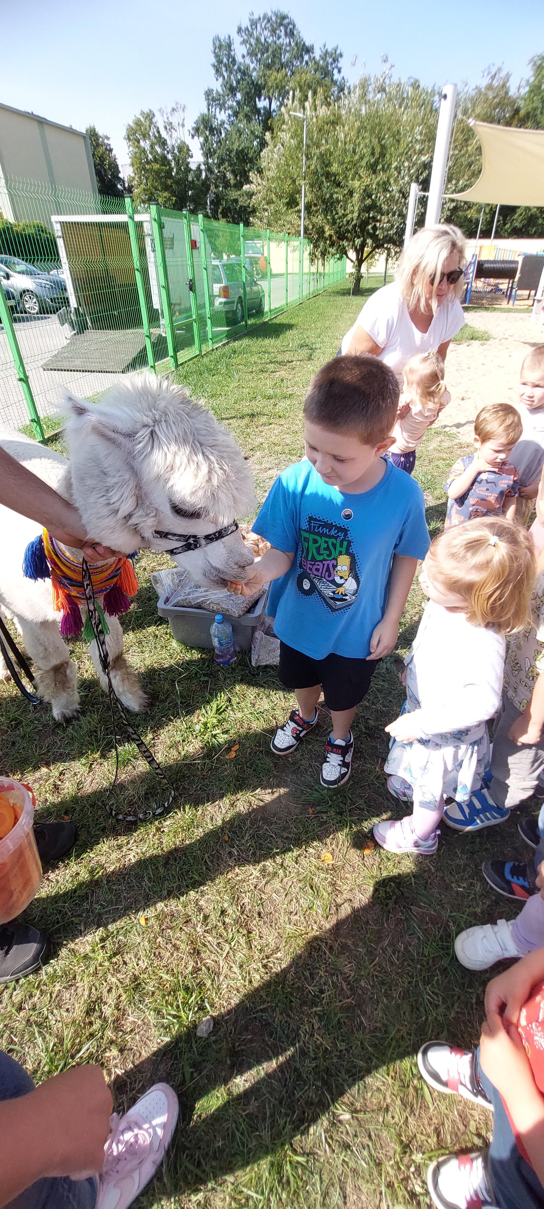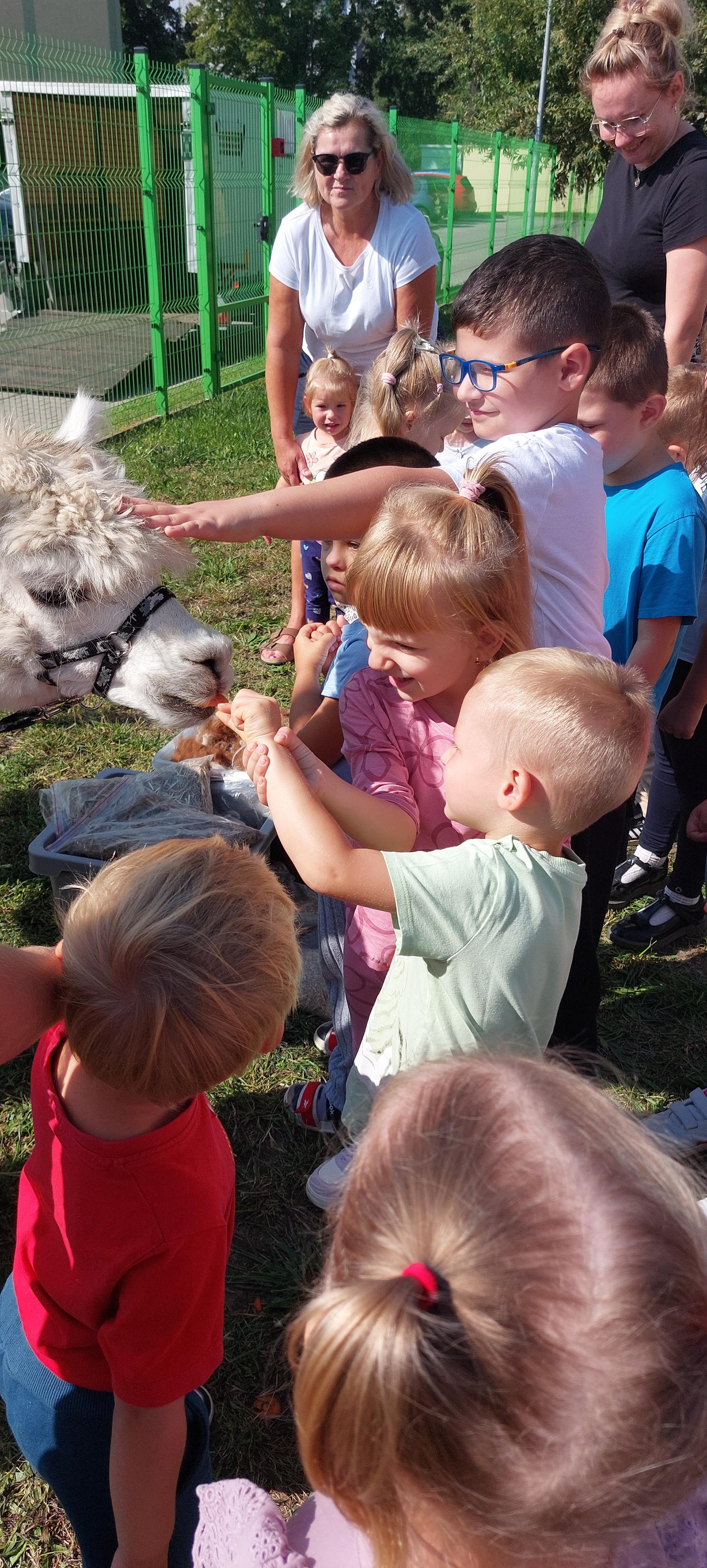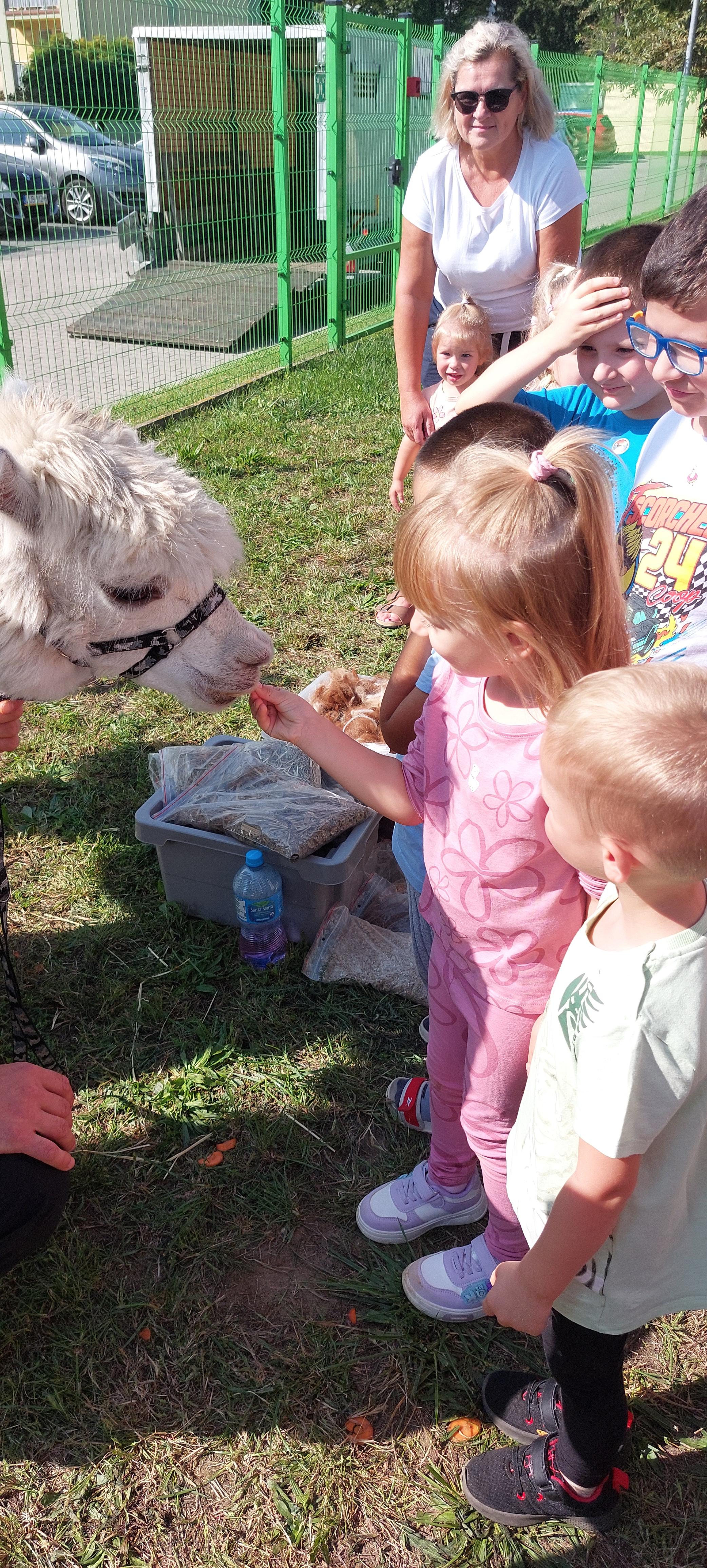 Na początku września do Naszego przedszkola zawitali wyjątkowi goście- Alpaki. Zwierzęta wzbudziły zachwyt u wszystkich dzieci oraz Pań. Dzieci dowiedziały się jak wygląda pielęgnacja zwierząt, jaki jest ulubiony przysmak, w jakiej pozycji śpią oraz jak często zażywają kąpieli. Każdy przedszkolak miał okazję nakarmić zwierzątko. Wizyta zwierząt sprawiła wszystkim dzieciom wiele radości, a dla niektórych przedszkolaków była to okazja do zmierzenia się z własnym lękiem.