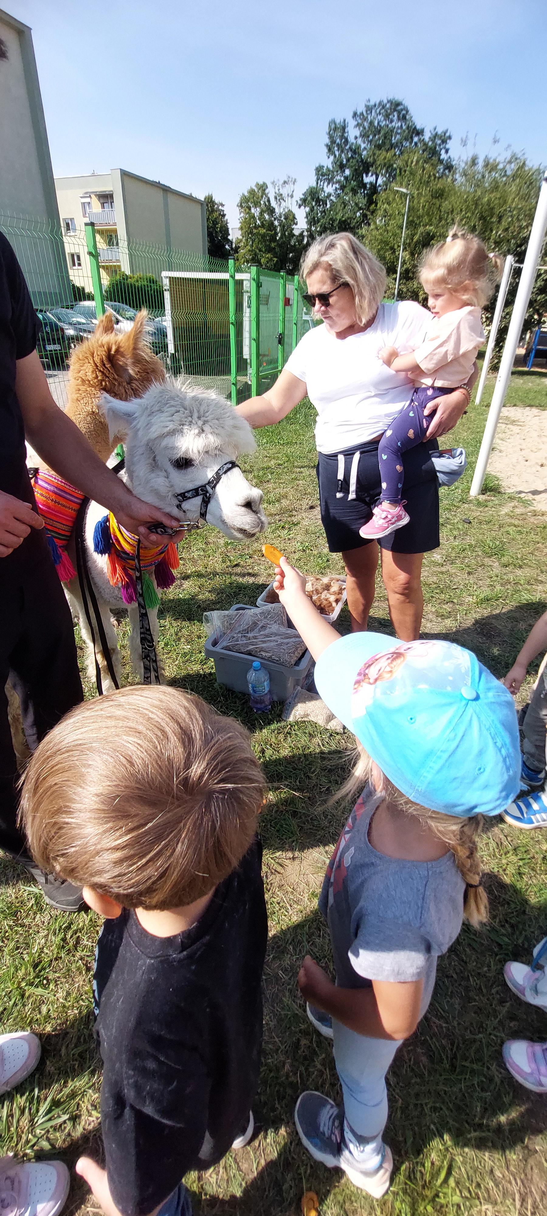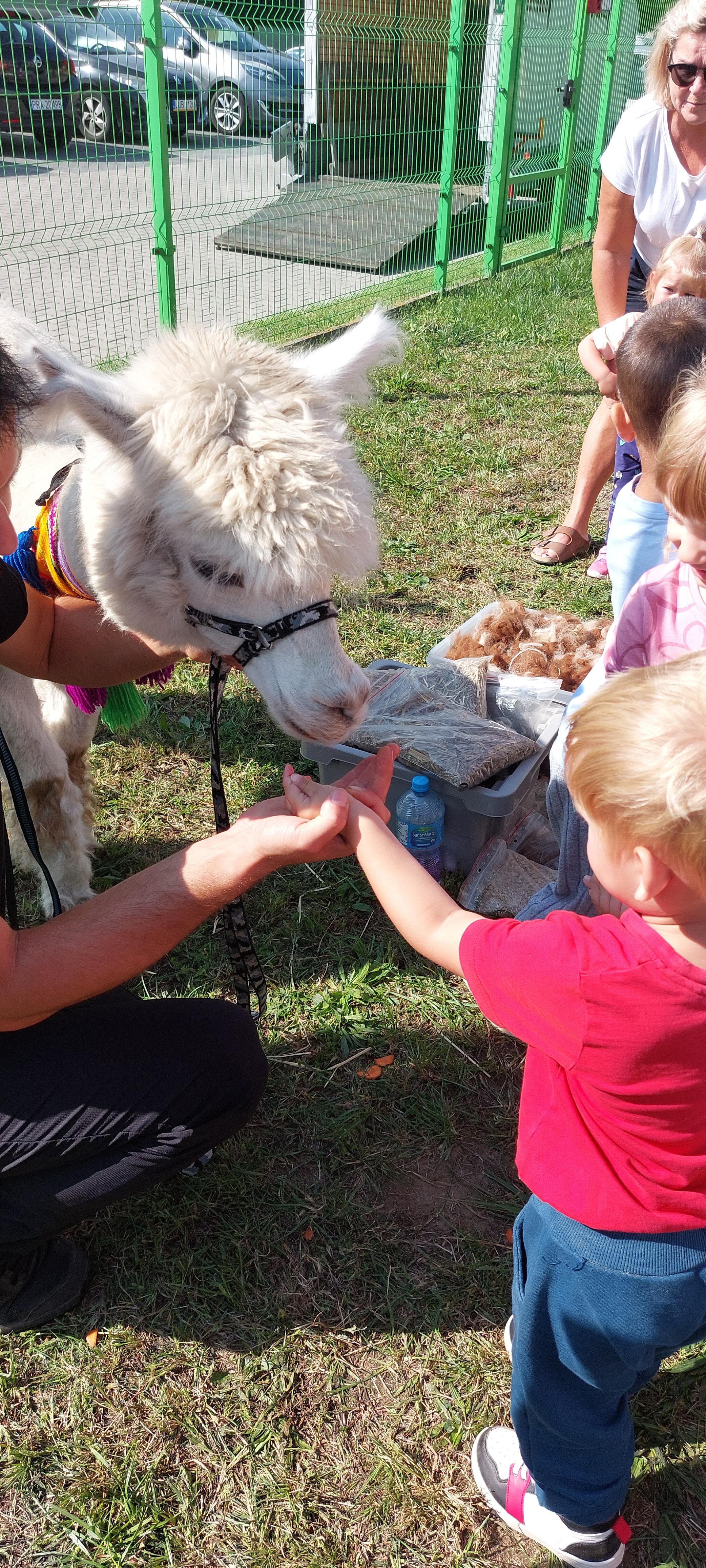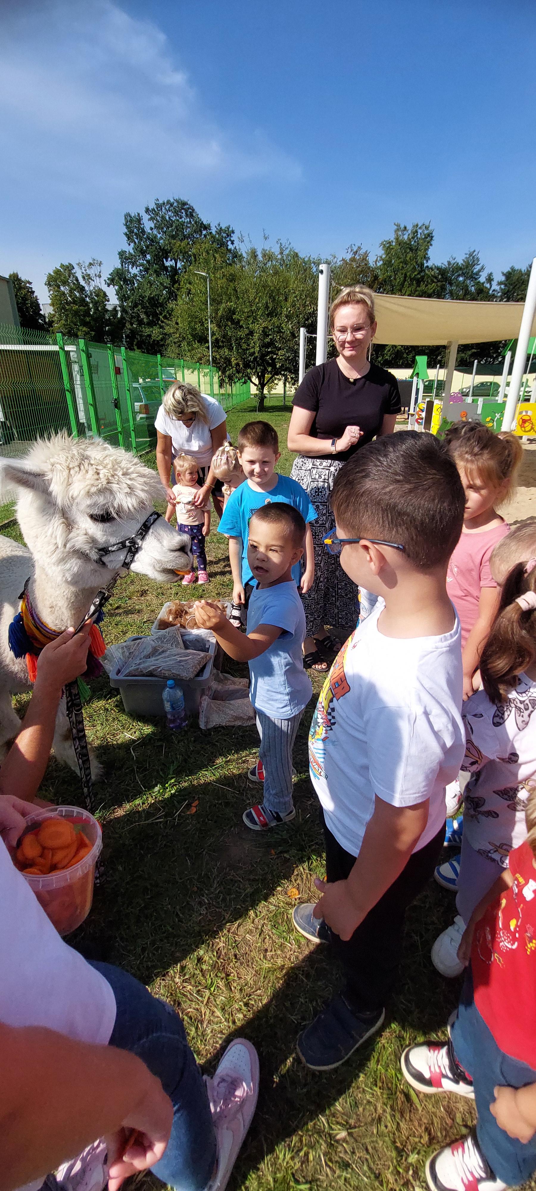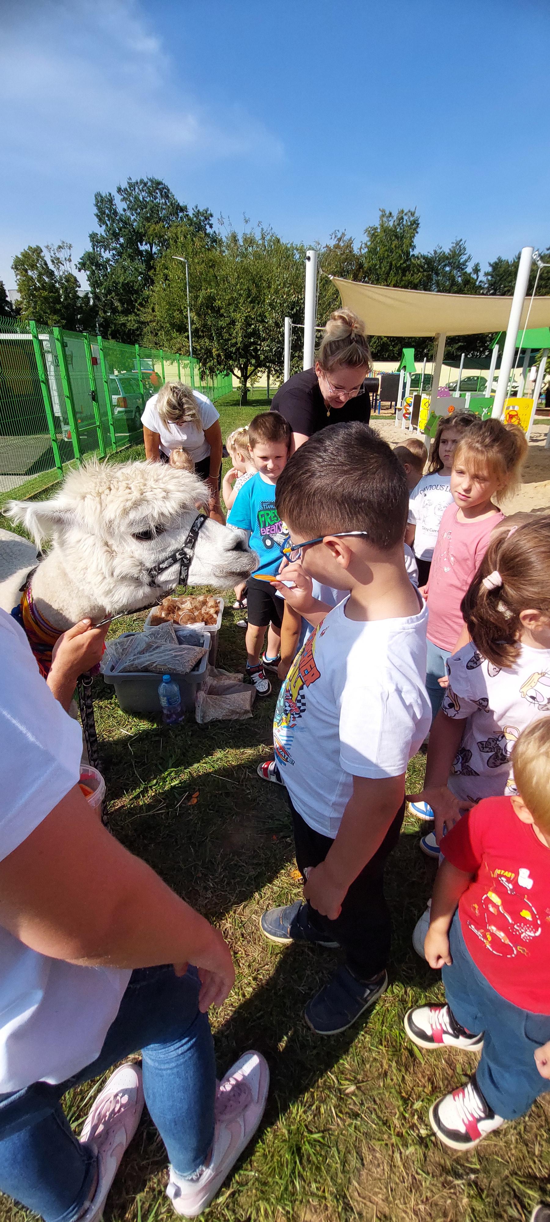 Na początku września do Naszego przedszkola zawitali wyjątkowi goście- Alpaki. Zwierzęta wzbudziły zachwyt u wszystkich dzieci oraz Pań. Dzieci dowiedziały się jak wygląda pielęgnacja zwierząt, jaki jest ulubiony przysmak, w jakiej pozycji śpią oraz jak często zażywają kąpieli. Każdy przedszkolak miał okazję nakarmić zwierzątko. Wizyta zwierząt sprawiła wszystkim dzieciom wiele radości, a dla niektórych przedszkolaków była to okazja do zmierzenia się z własnym lękiem.