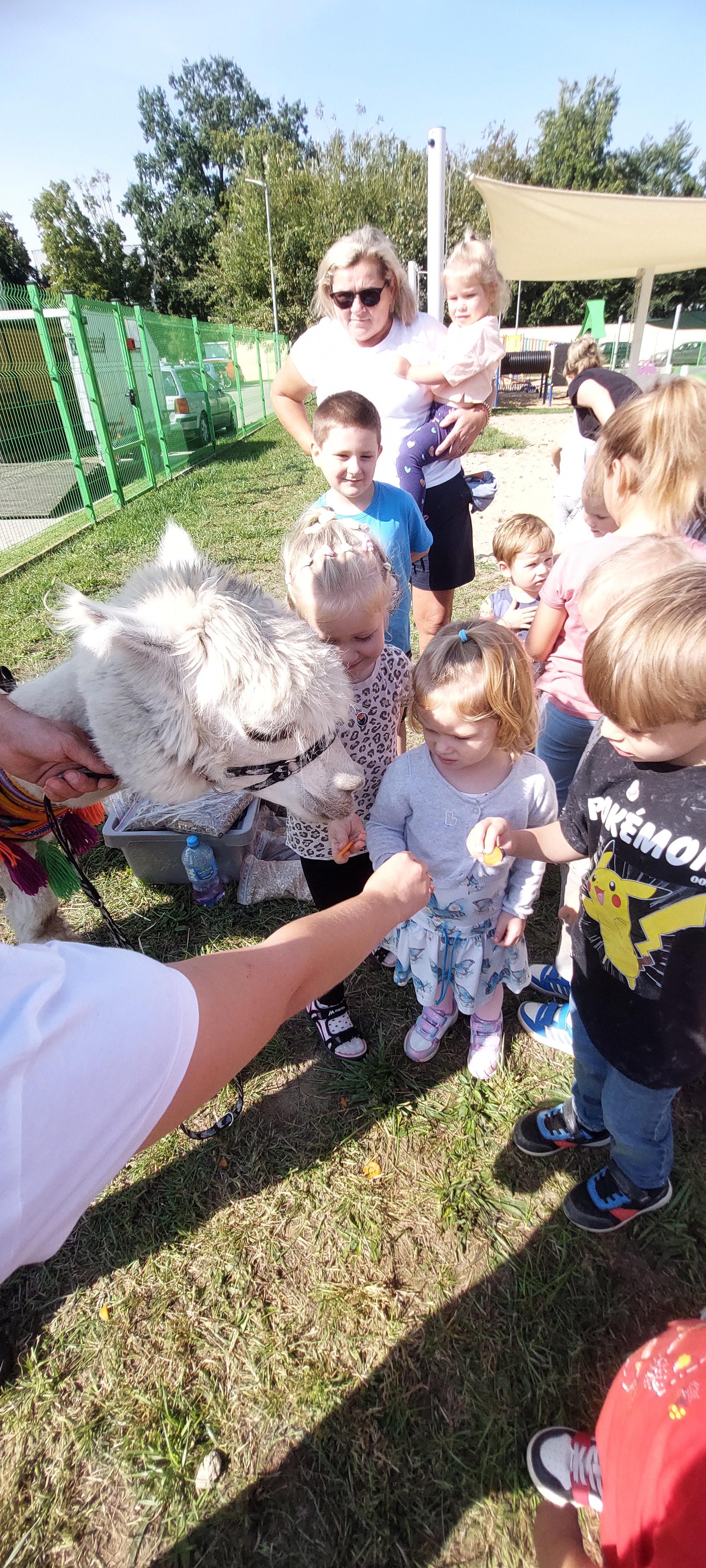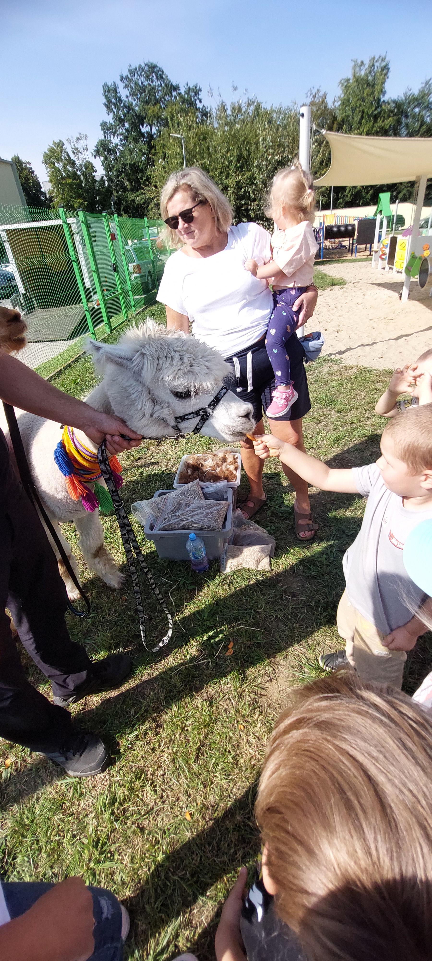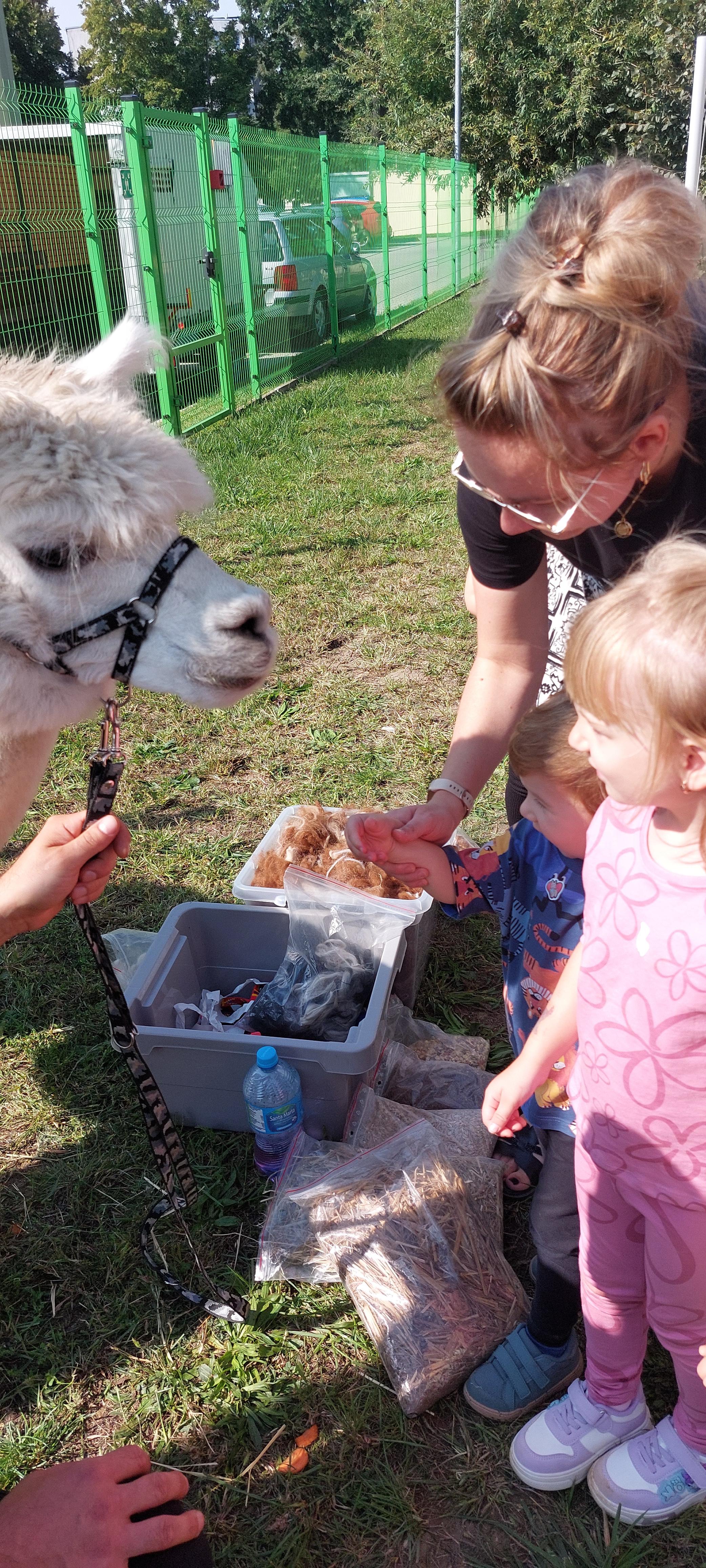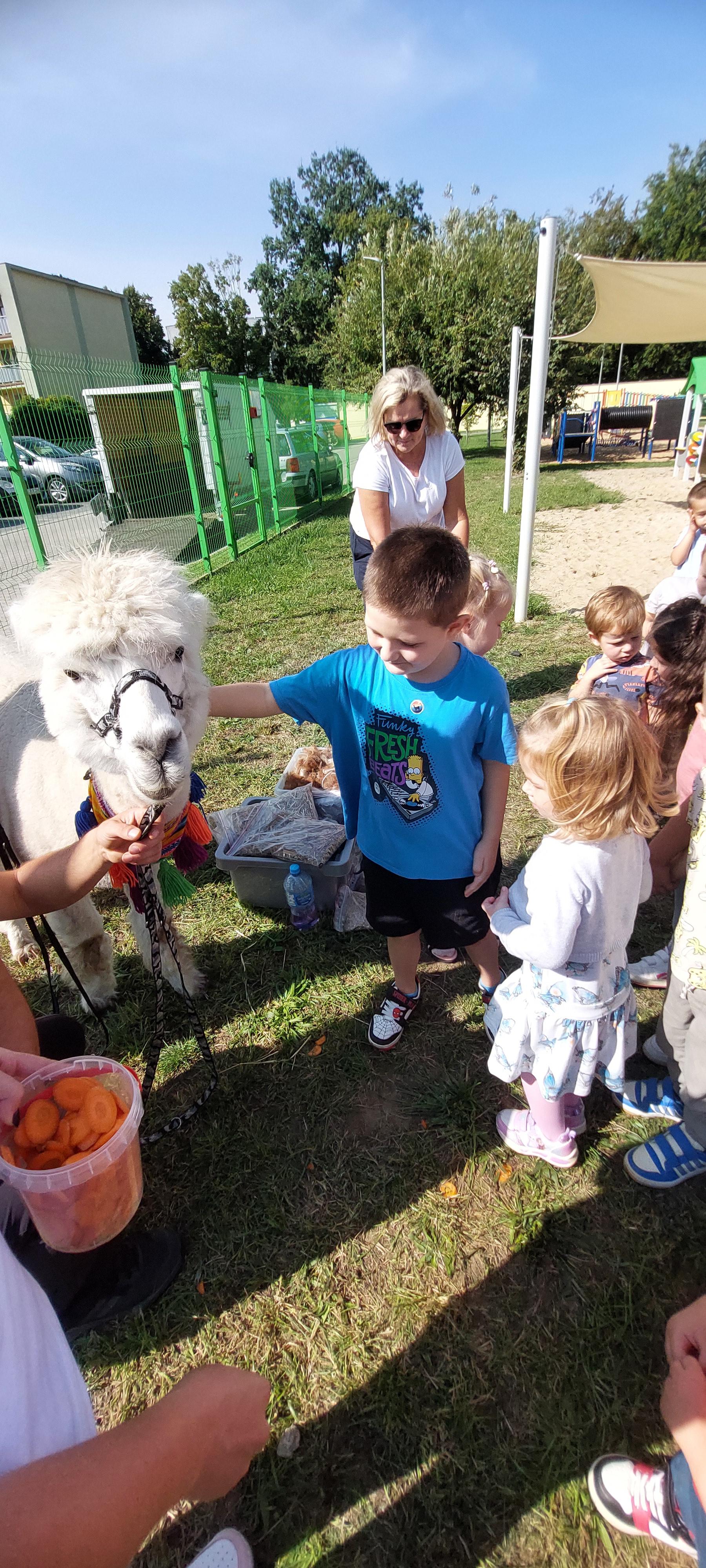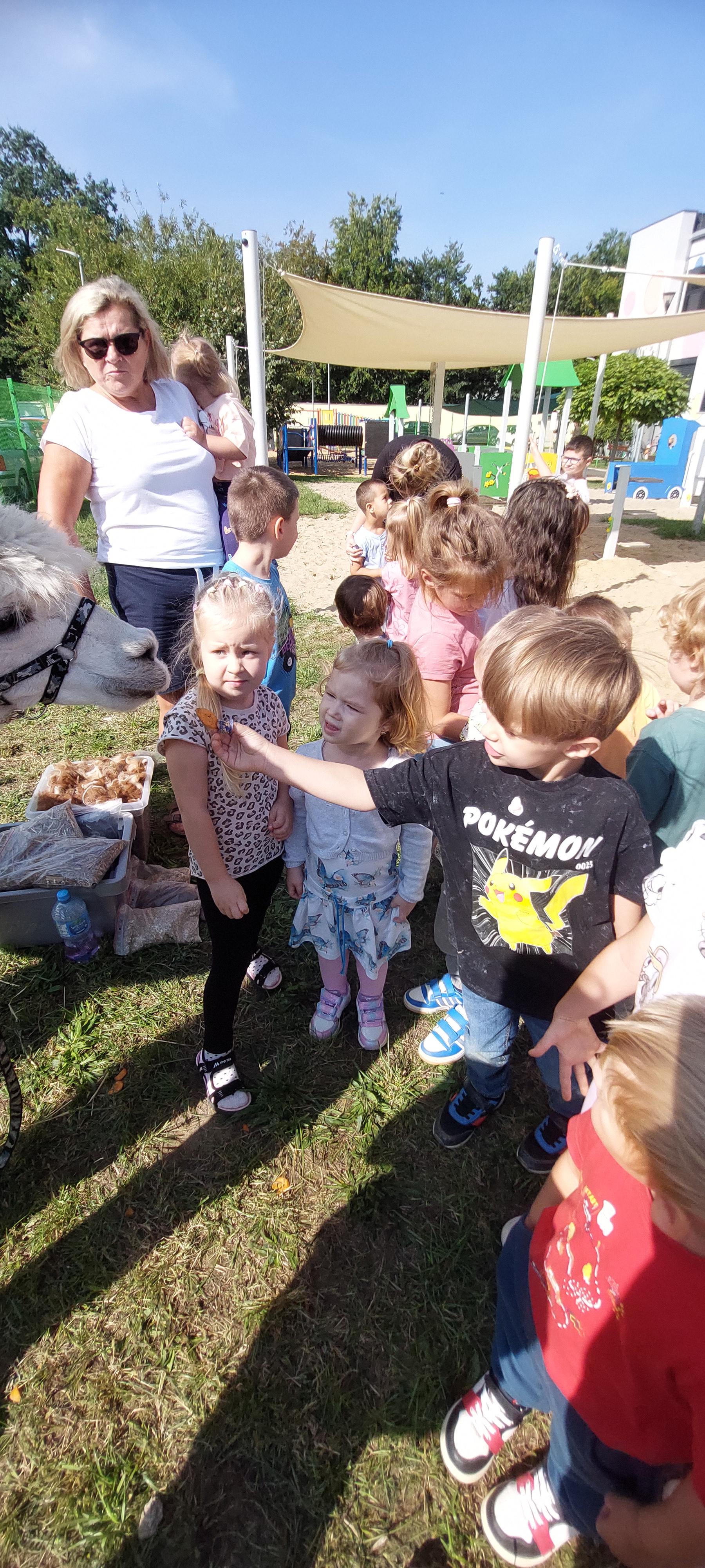 Na początku września do Naszego przedszkola zawitali wyjątkowi goście- Alpaki. Zwierzęta wzbudziły zachwyt u wszystkich dzieci oraz Pań. Dzieci dowiedziały się jak wygląda pielęgnacja zwierząt, jaki jest ulubiony przysmak, w jakiej pozycji śpią oraz jak często zażywają kąpieli. Każdy przedszkolak miał okazję nakarmić zwierzątko. Wizyta zwierząt sprawiła wszystkim dzieciom wiele radości, a dla niektórych przedszkolaków była to okazja do zmierzenia się z własnym lękiem.