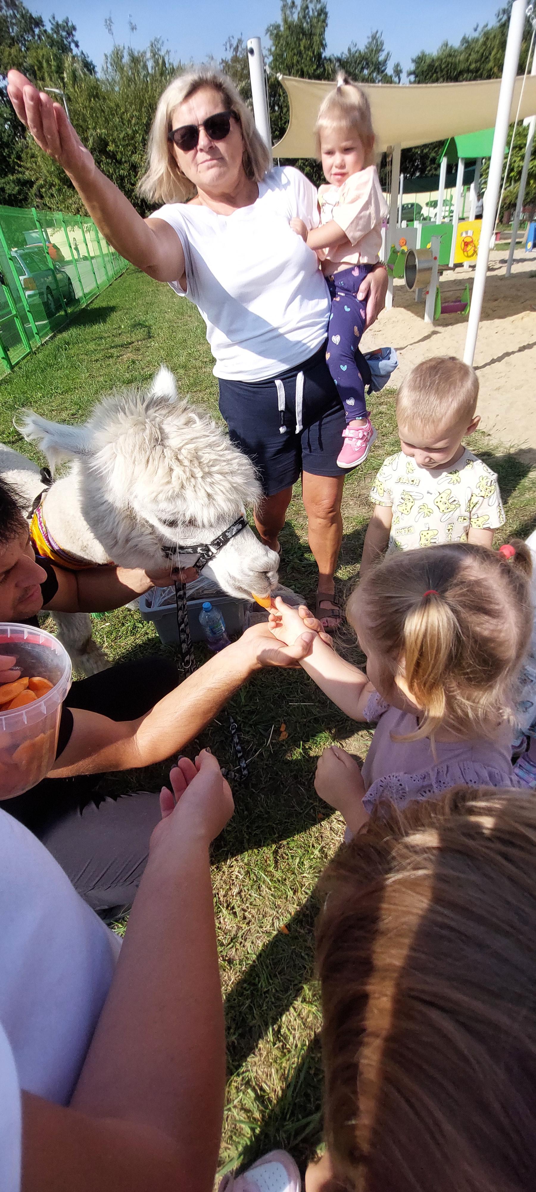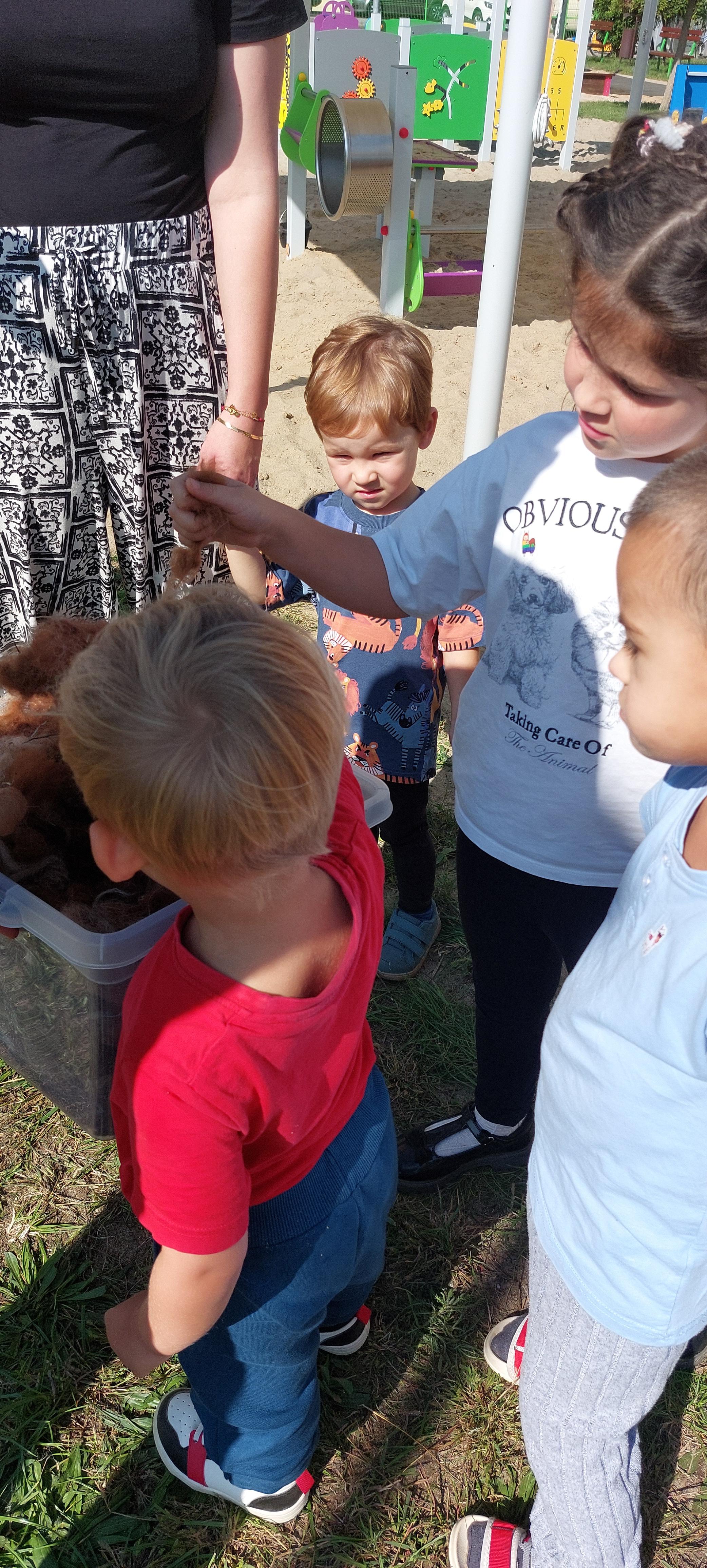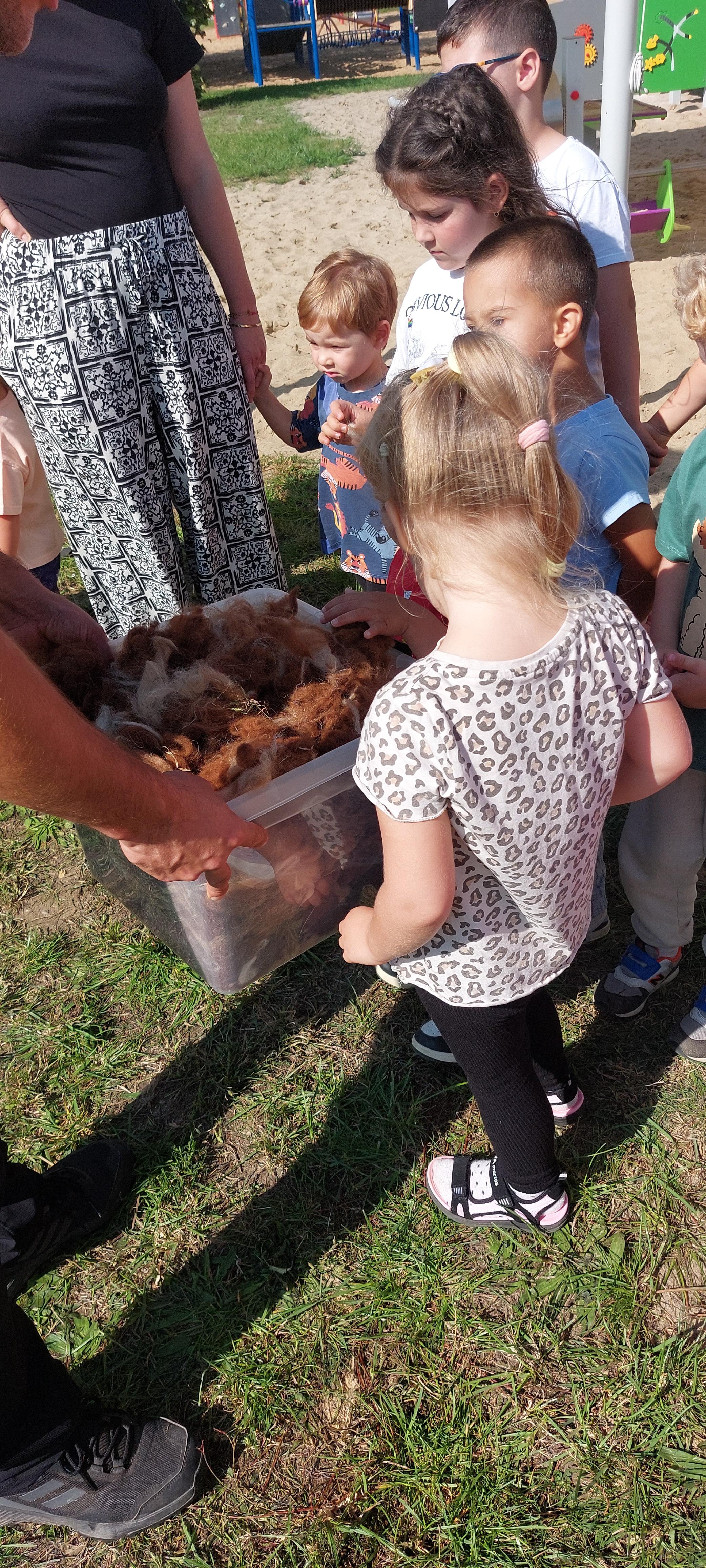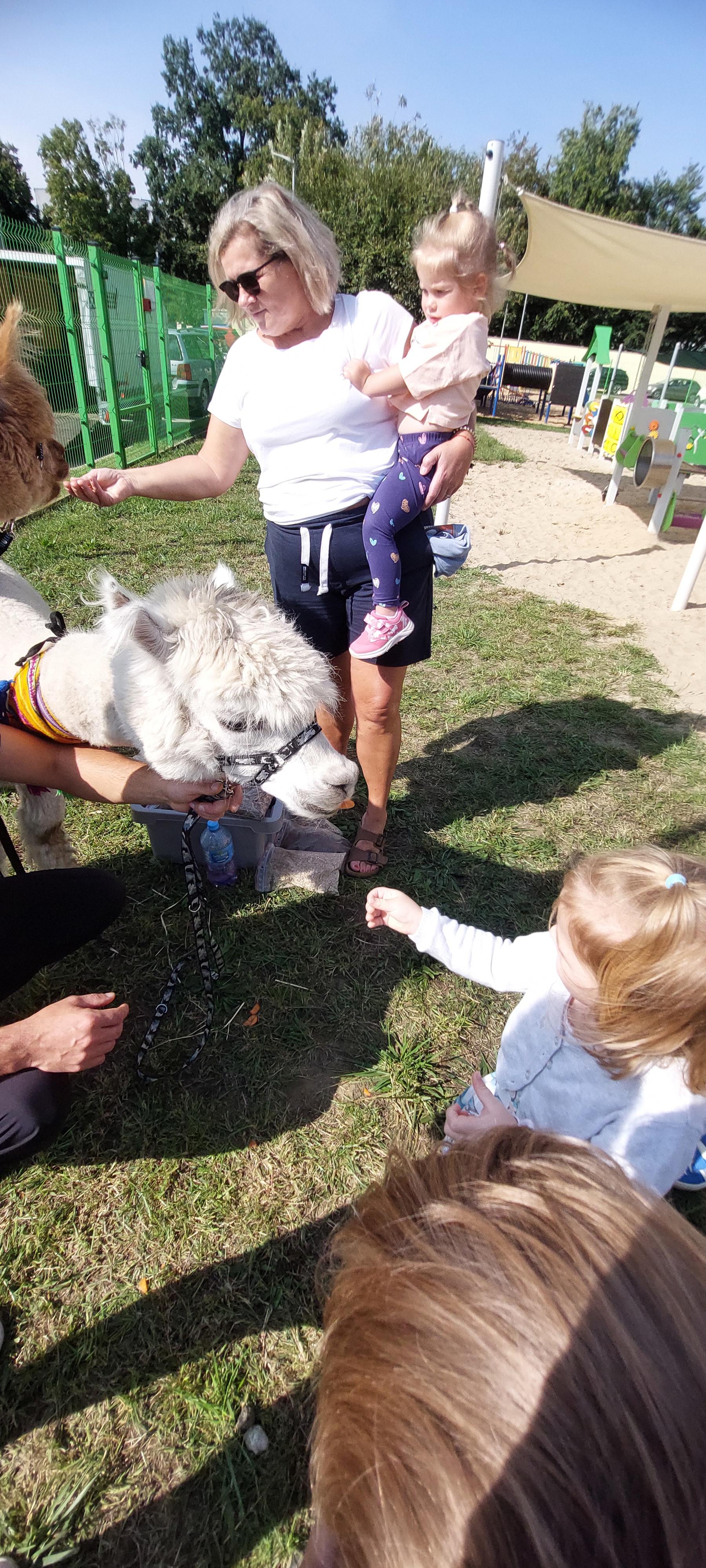 Na początku września do Naszego przedszkola zawitali wyjątkowi goście- Alpaki. Zwierzęta wzbudziły zachwyt u wszystkich dzieci oraz Pań. Dzieci dowiedziały się jak wygląda pielęgnacja zwierząt, jaki jest ulubiony przysmak, w jakiej pozycji śpią oraz jak często zażywają kąpieli. Każdy przedszkolak miał okazję nakarmić zwierzątko. Wizyta zwierząt sprawiła wszystkim dzieciom wiele radości, a dla niektórych przedszkolaków była to okazja do zmierzenia się z własnym lękiem.