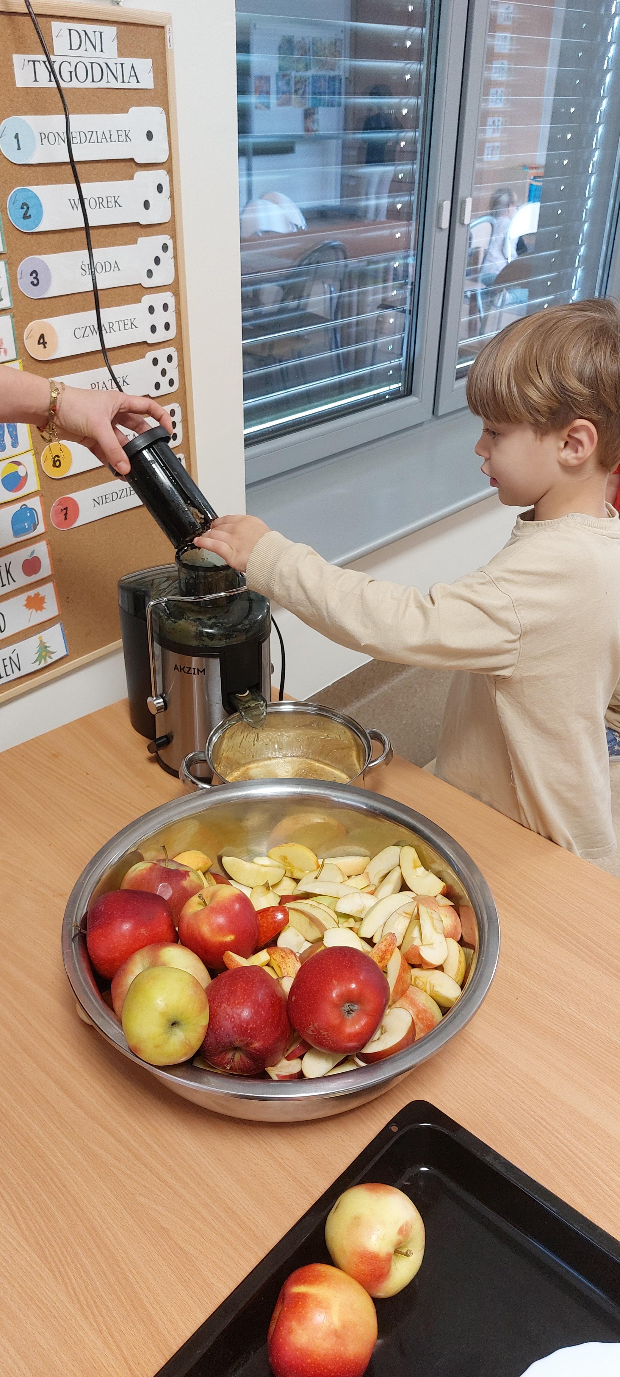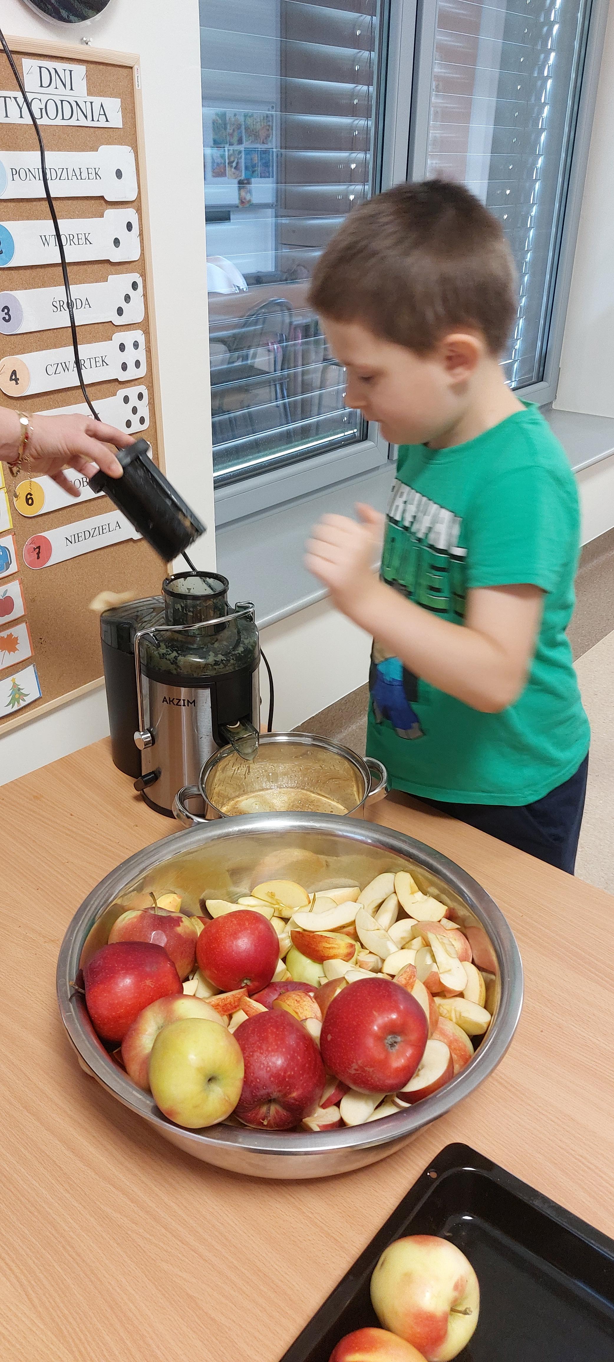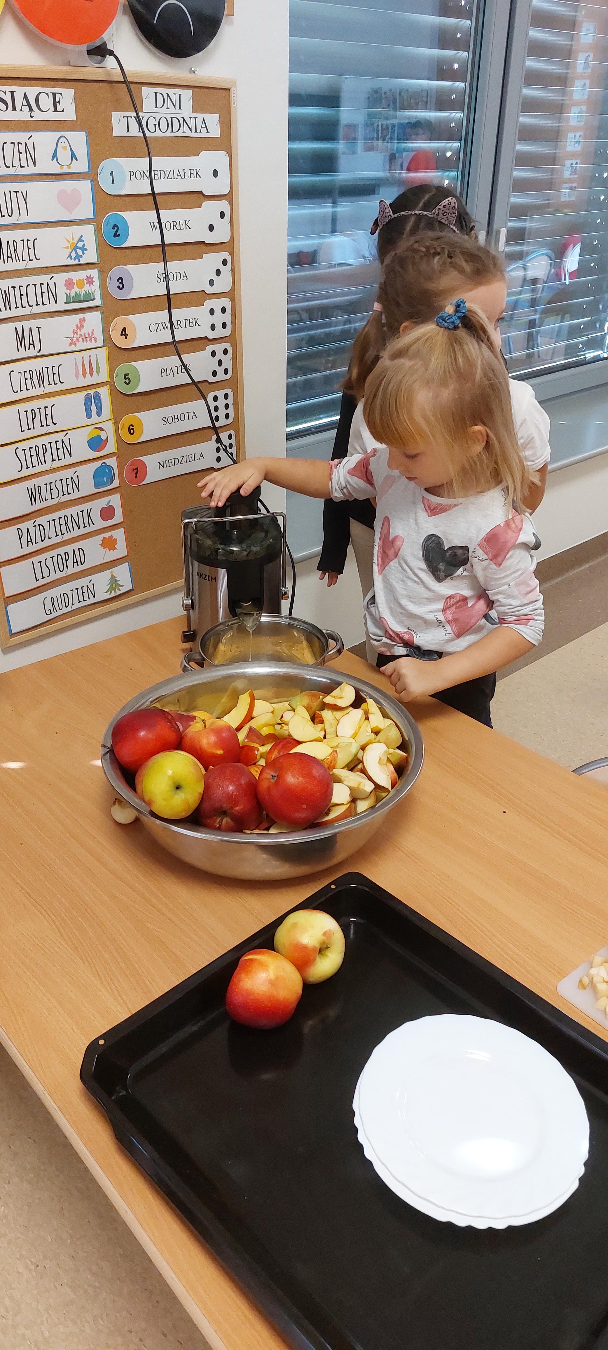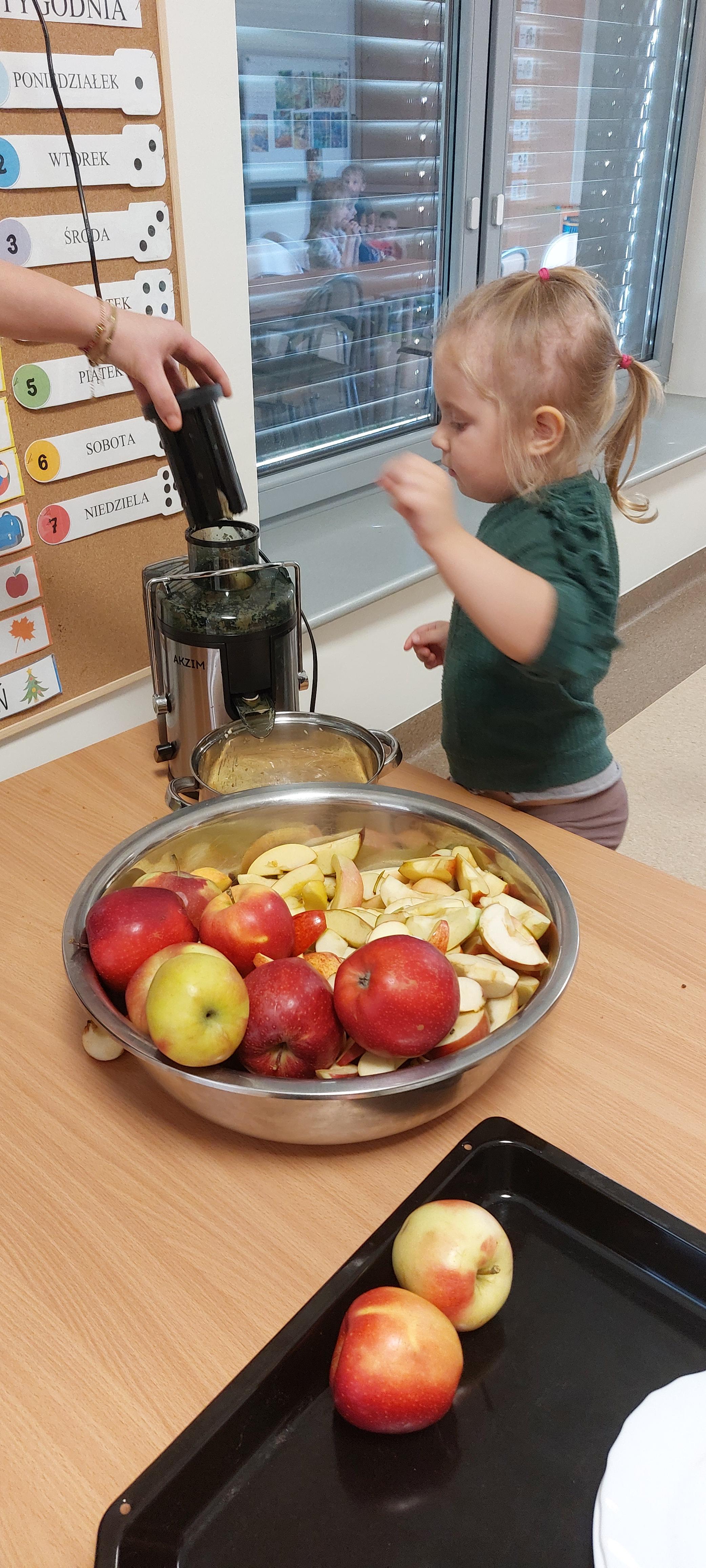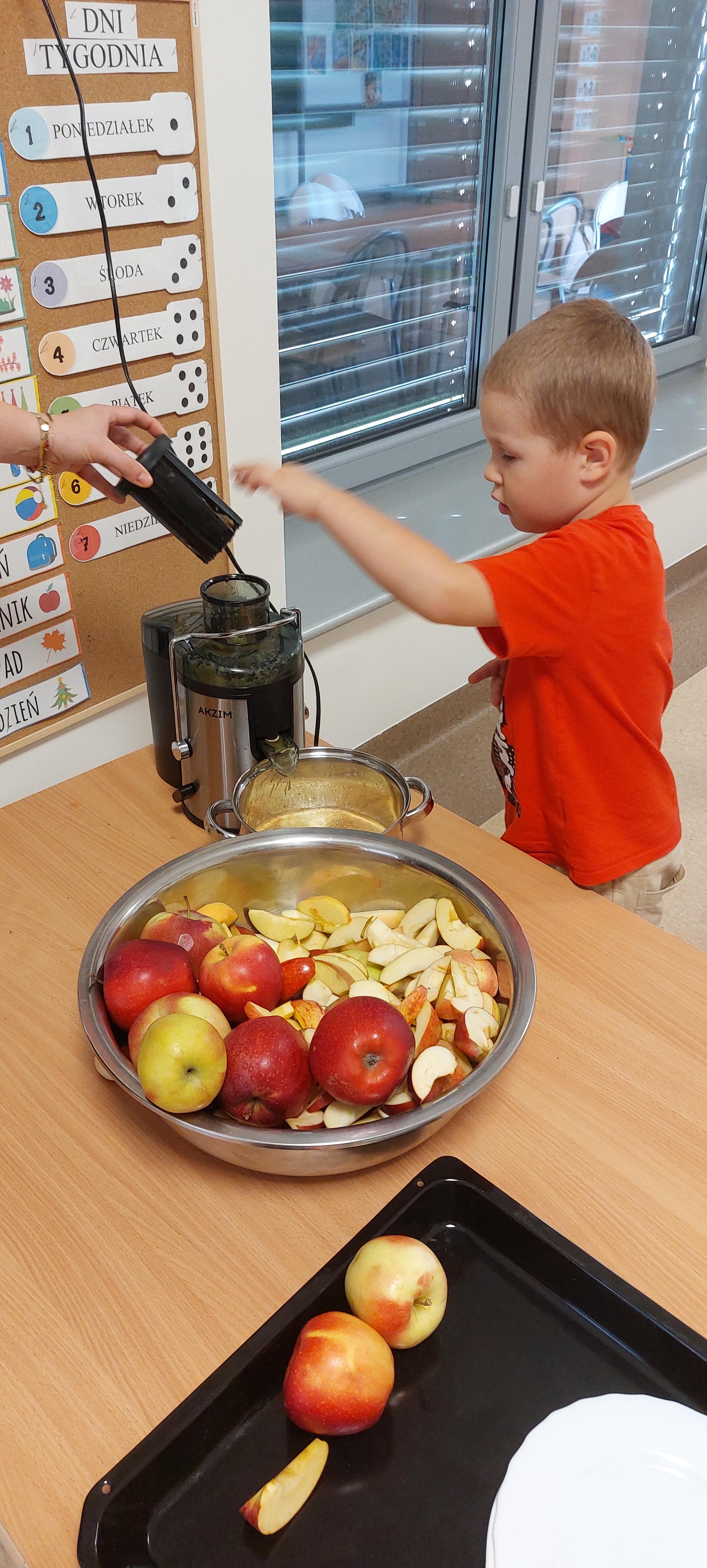 W piątek dzieci z grupy "Skrzaty" obchodziły Dzień Jabłka. Na początku odbyła się pogadanka na temat jego wyglądu, kolorów, wielkości, kształtu, smaku, różnych odmian. Później dzieci wykonały babeczki oraz sok jabłkowy, a także zajadały się surowymi jabłkami. Następnie wykonały prace plastyczną- jabłkowe pieczątki w słoiku oraz malowały za pomocą farby jabłka na worku strunowym. Na twarzach dzieci gościły uśmiechy.