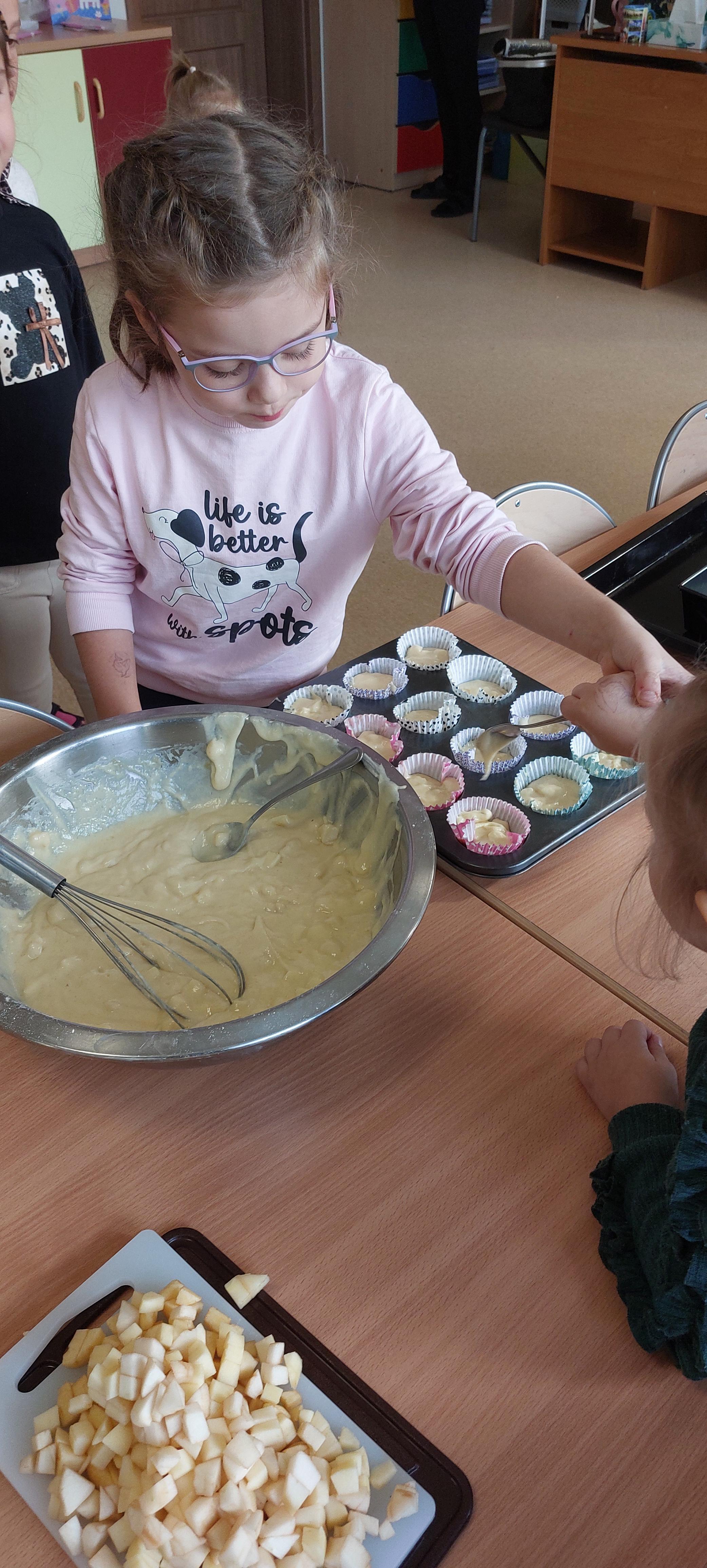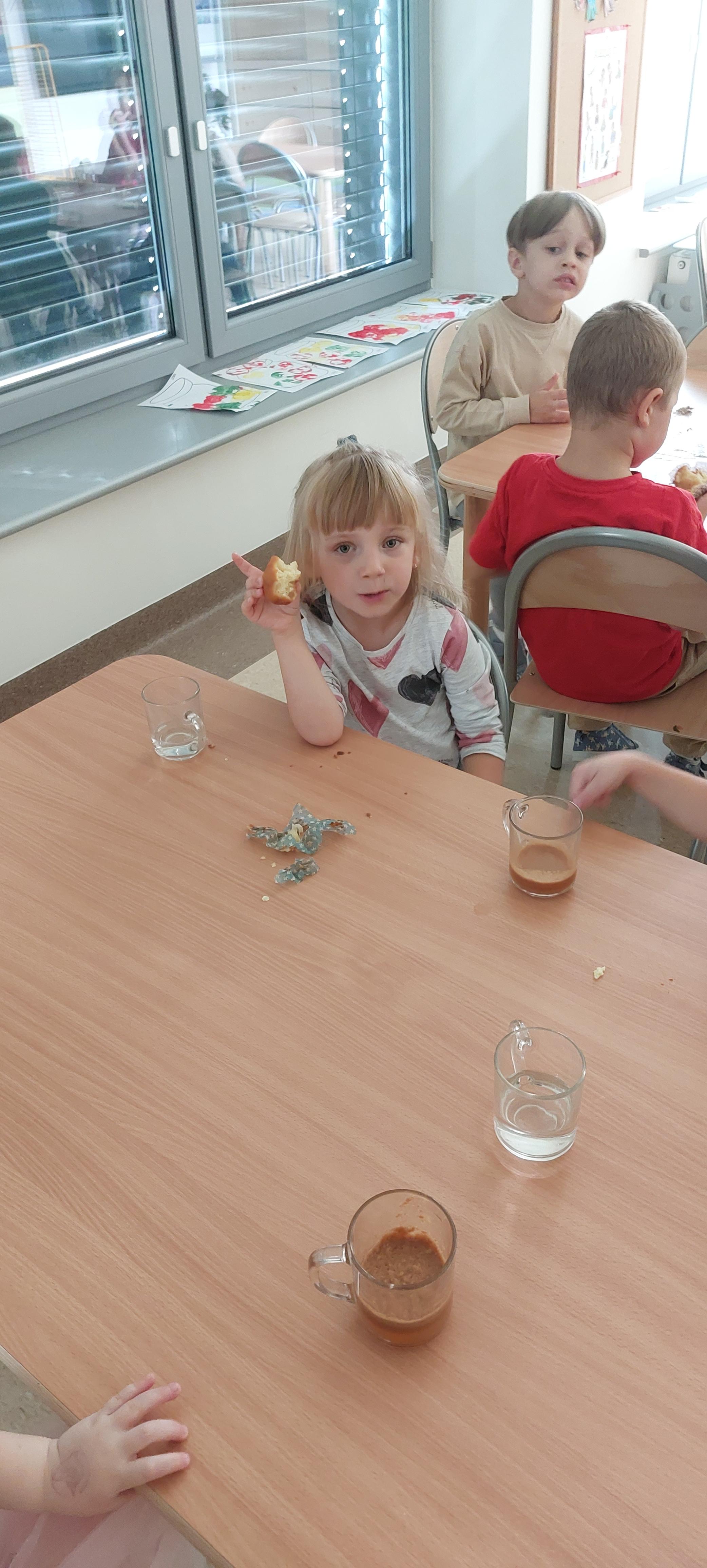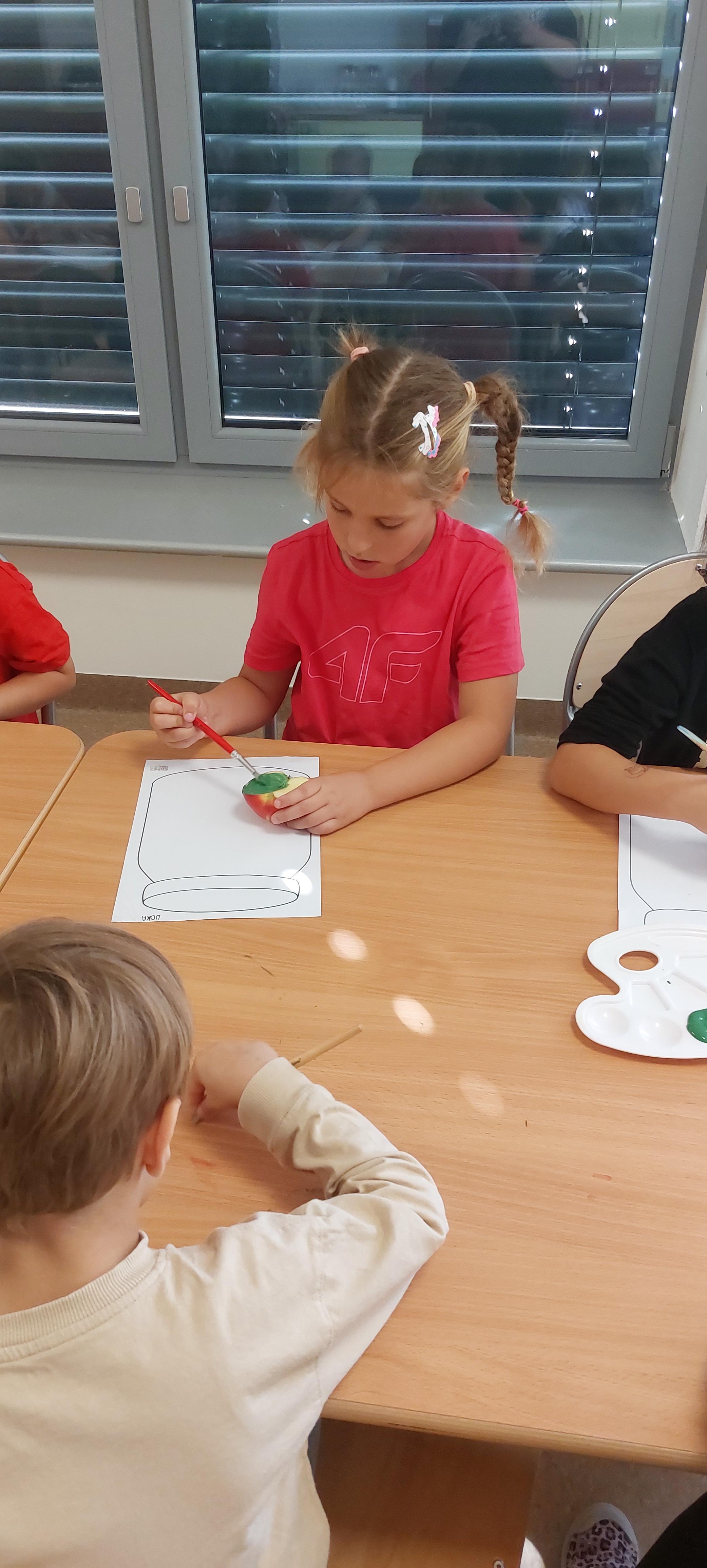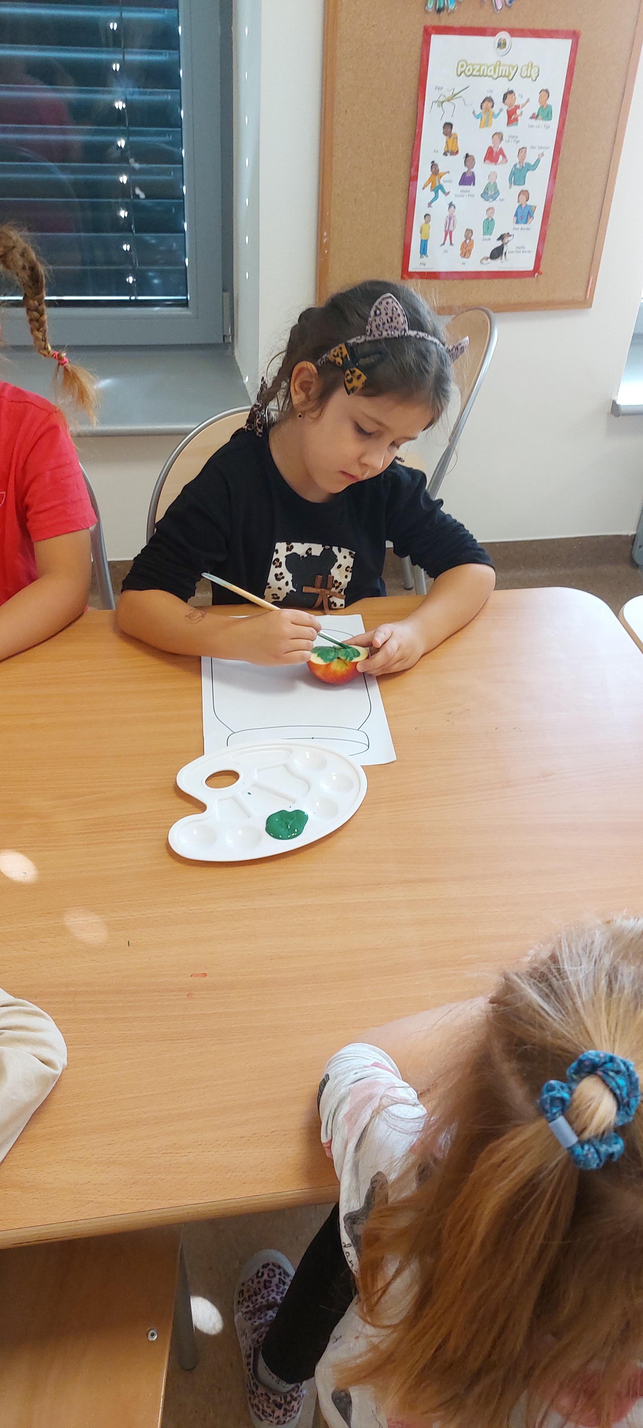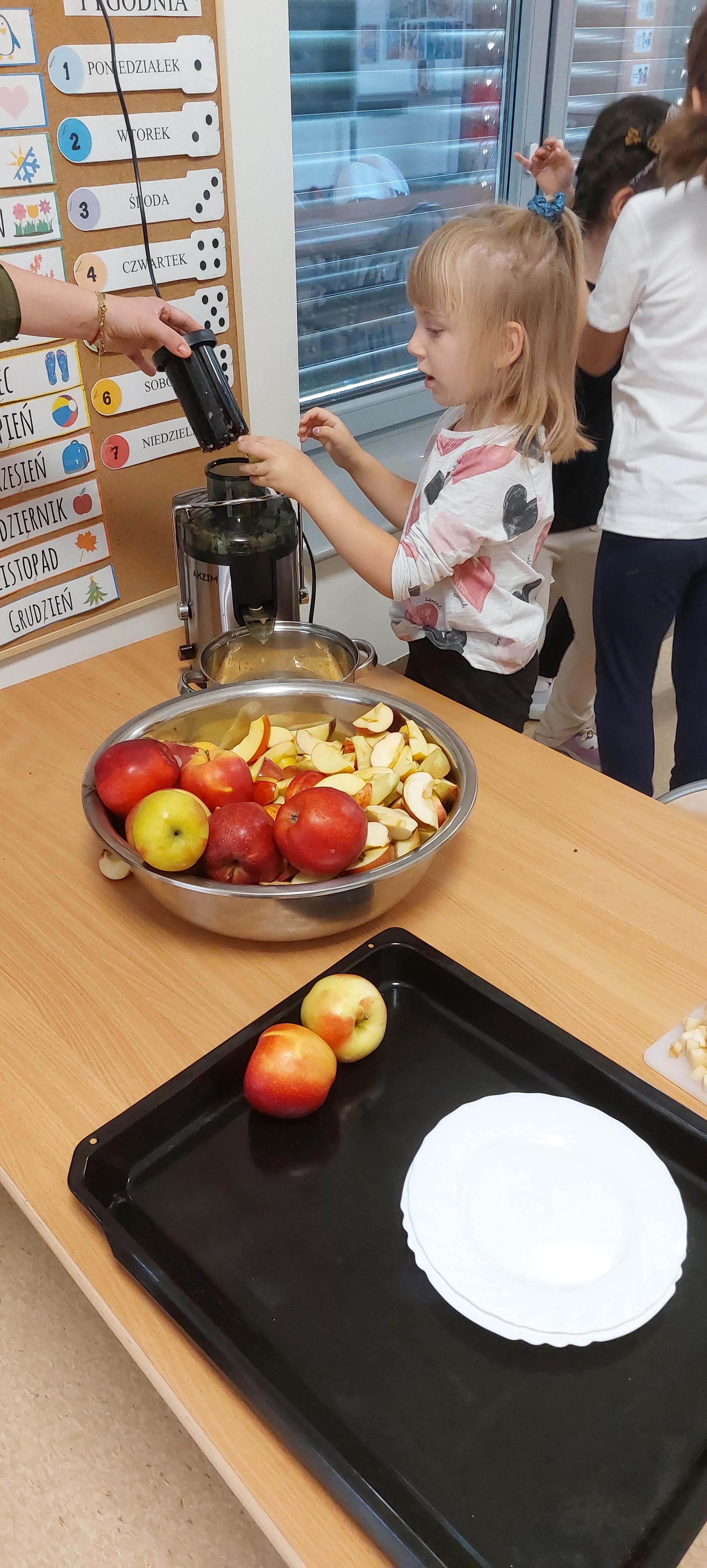 W piątek dzieci z grupy "Skrzaty" obchodziły Dzień Jabłka. Na początku odbyła się pogadanka na temat jego wyglądu, kolorów, wielkości, kształtu, smaku, różnych odmian. Później dzieci wykonały babeczki oraz sok jabłkowy, a także zajadały się surowymi jabłkami. Następnie wykonały prace plastyczną- jabłkowe pieczątki w słoiku oraz malowały za pomocą farby jabłka na worku strunowym. Na twarzach dzieci gościły uśmiechy.