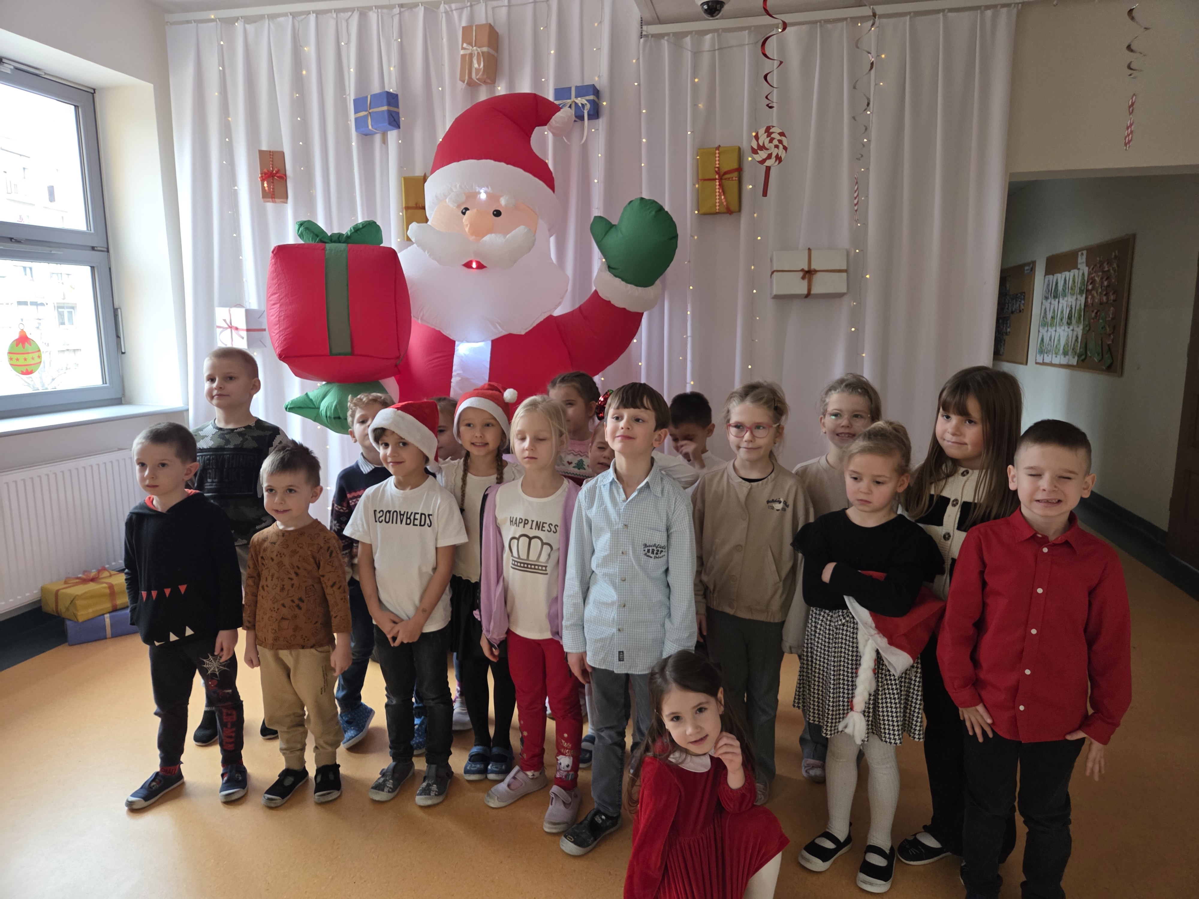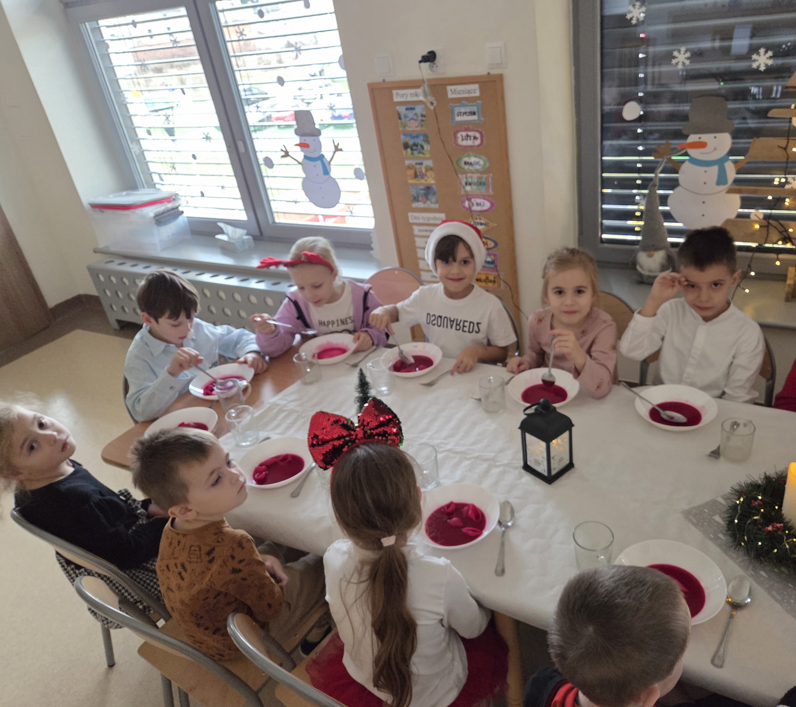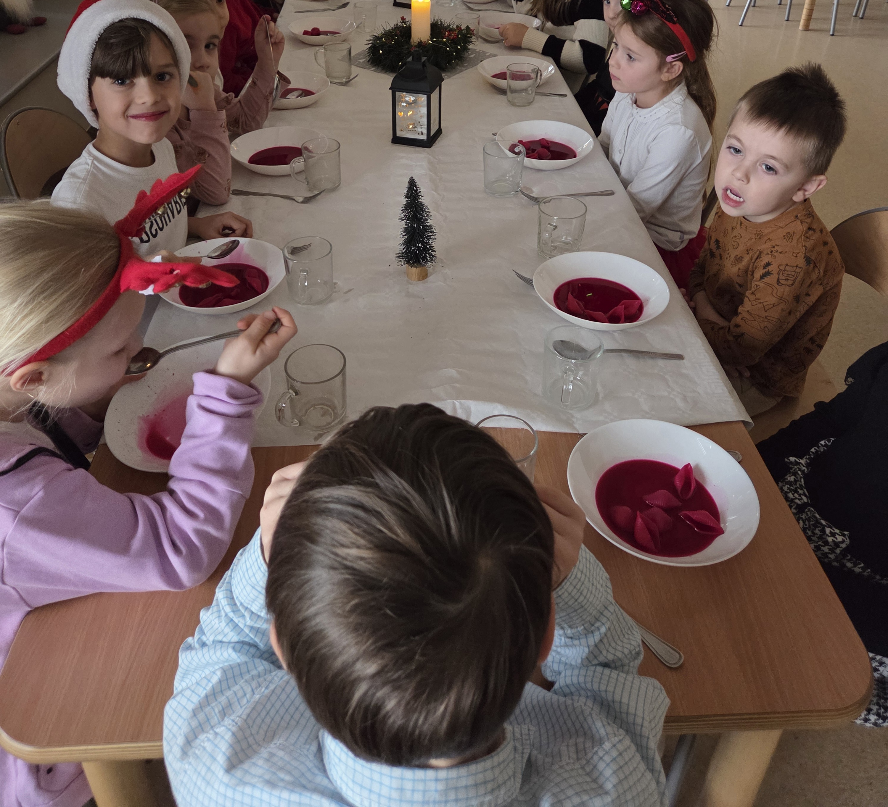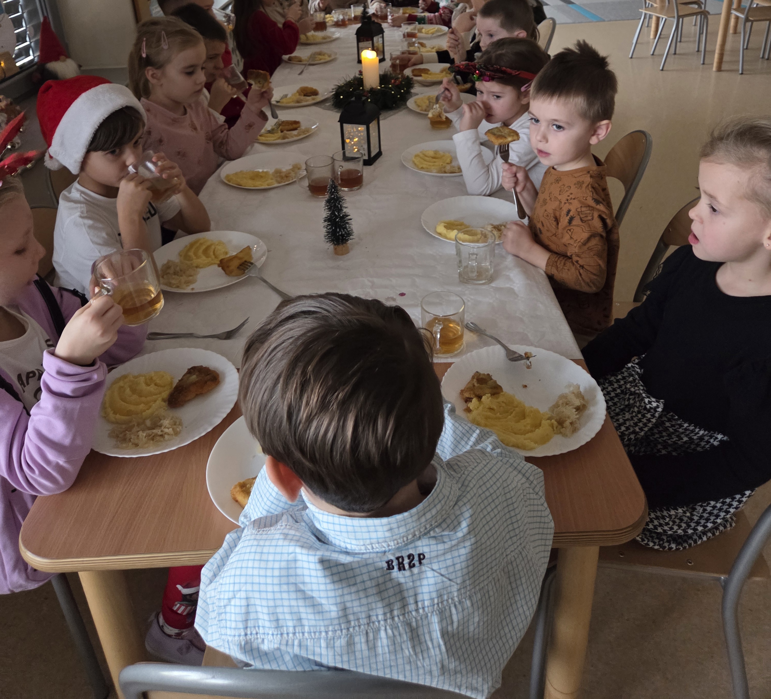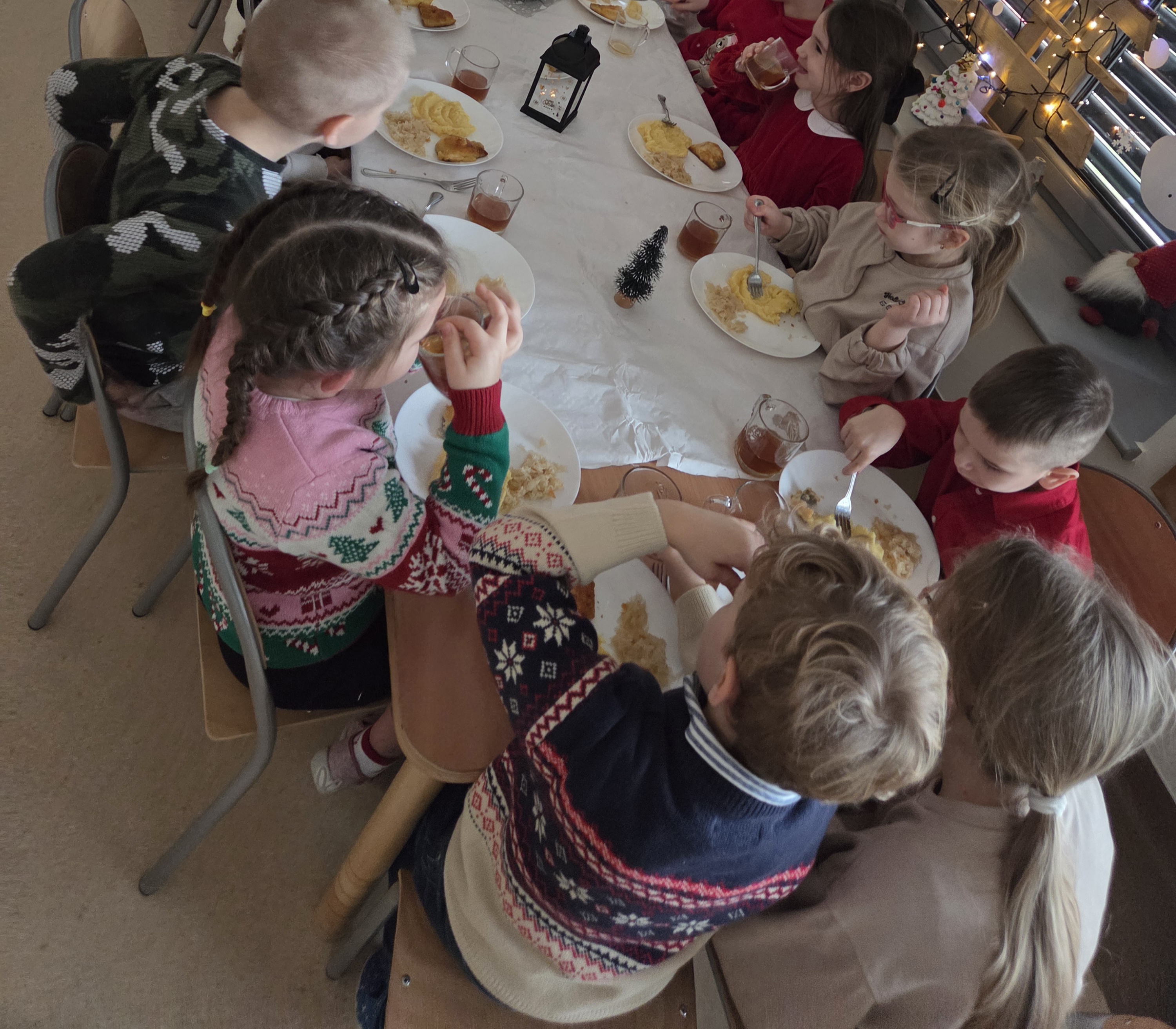 W wyjątkowej, świątecznej atmosferze dzieci z grup: Muchomorki i Żwirki wspólnie zasiadły do świątecznego obiadu. Uroczyście nakryte stoły, dekoracje oraz radosny nastrój sprawiły, że ten dzień był pełen ciepła i życzliwości. Był to czas rozmów, uśmiechów oraz wspólnego celebrowania nadchodzących Świąt Bożego Narodzenia.