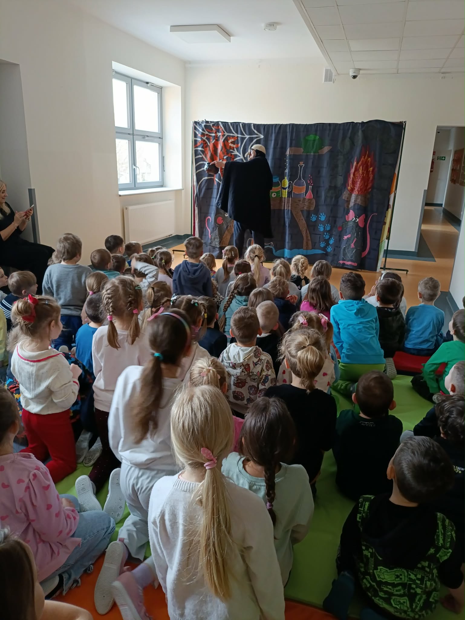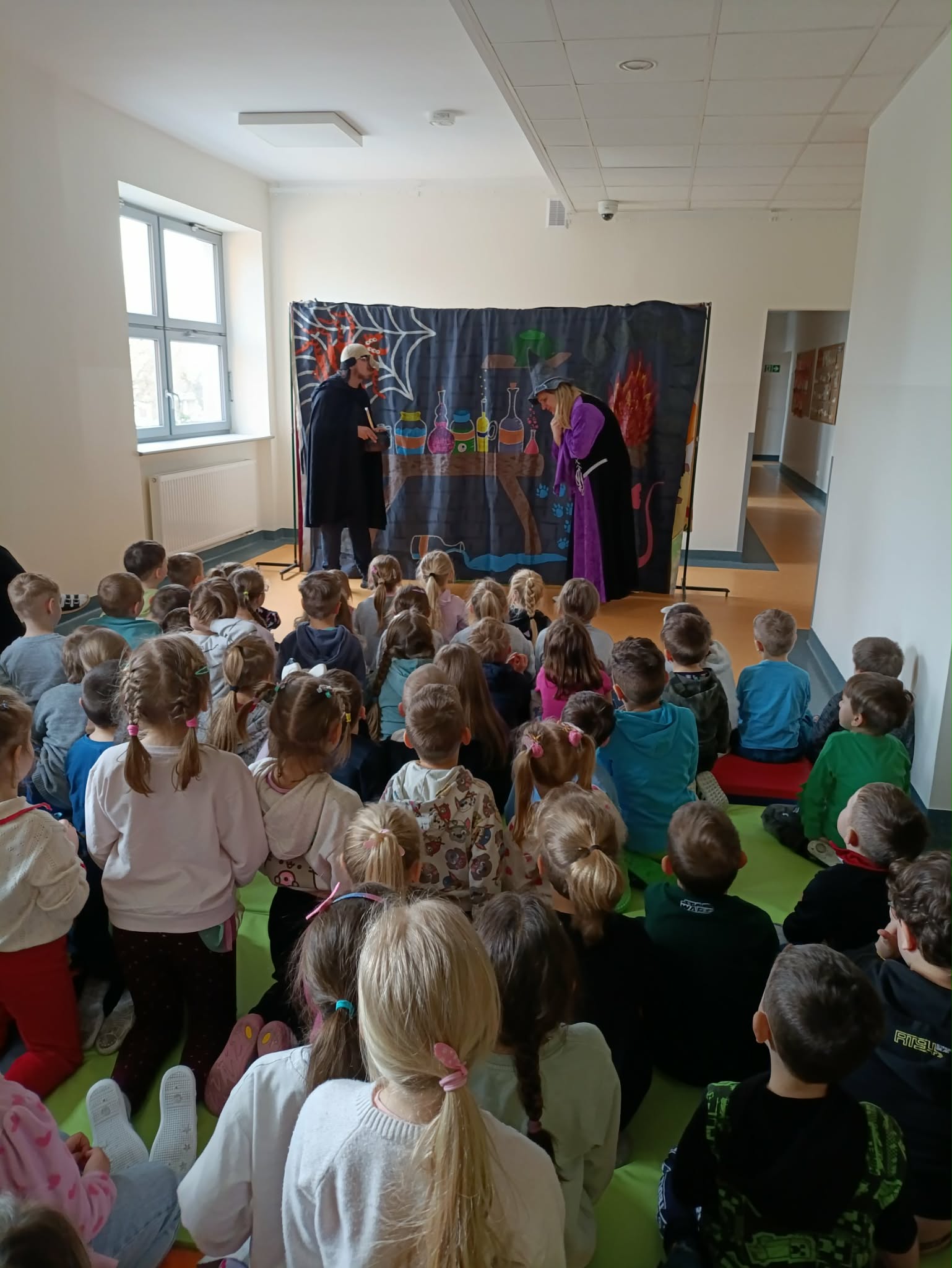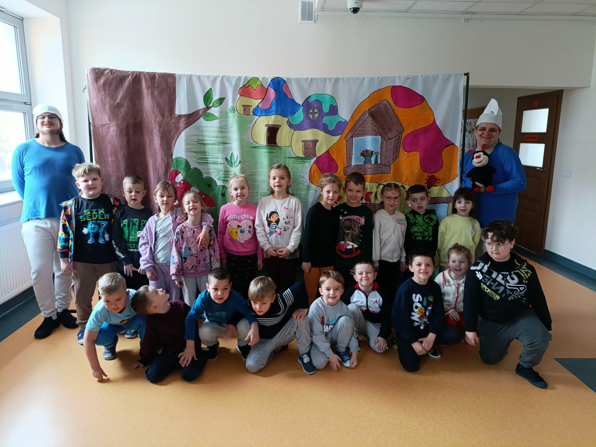 Dzisiaj w przedszkolu odwiedzili nas aktorzy, którzy wcielili się w rolę Smerfów i złej czarownicy.