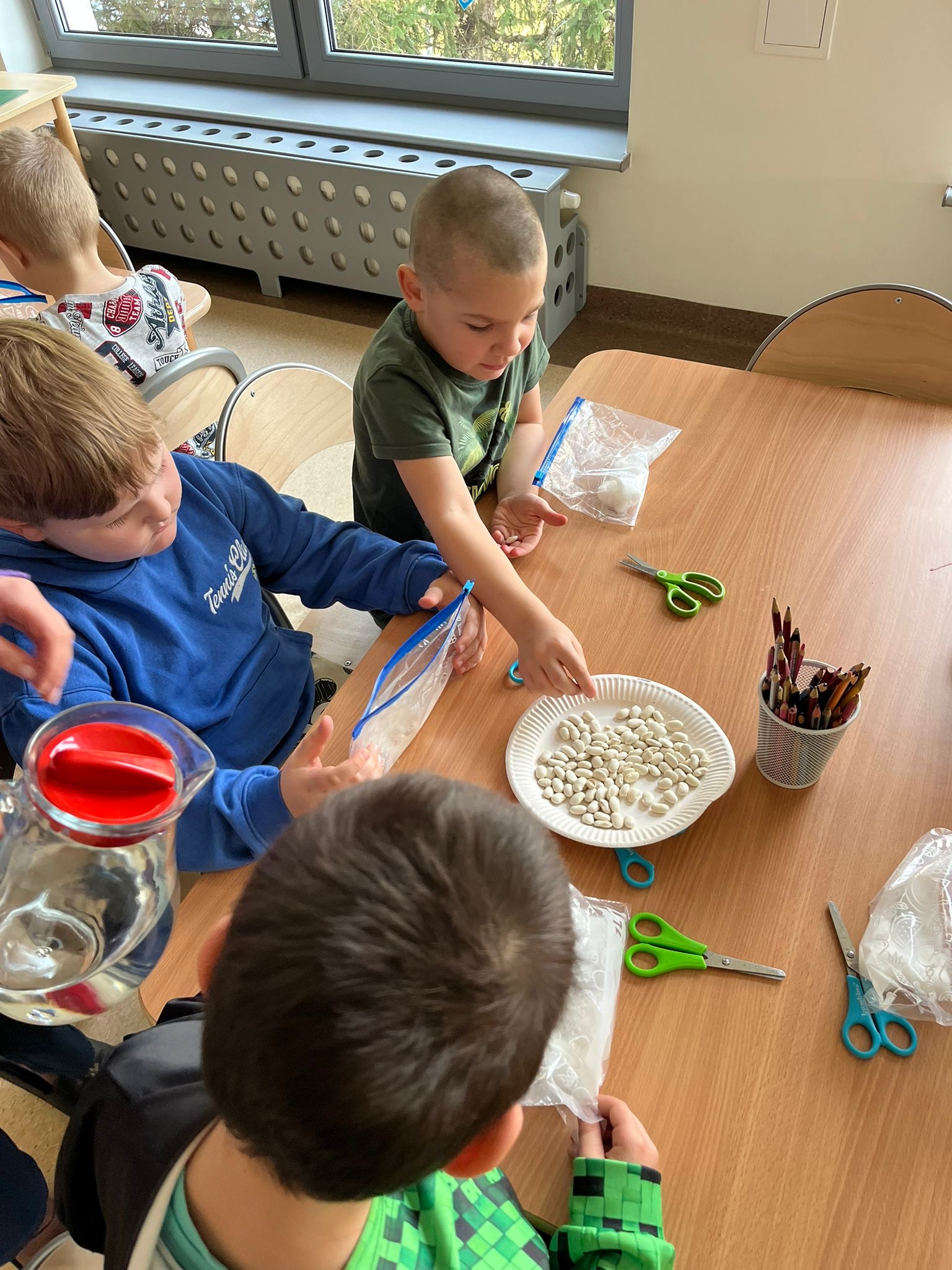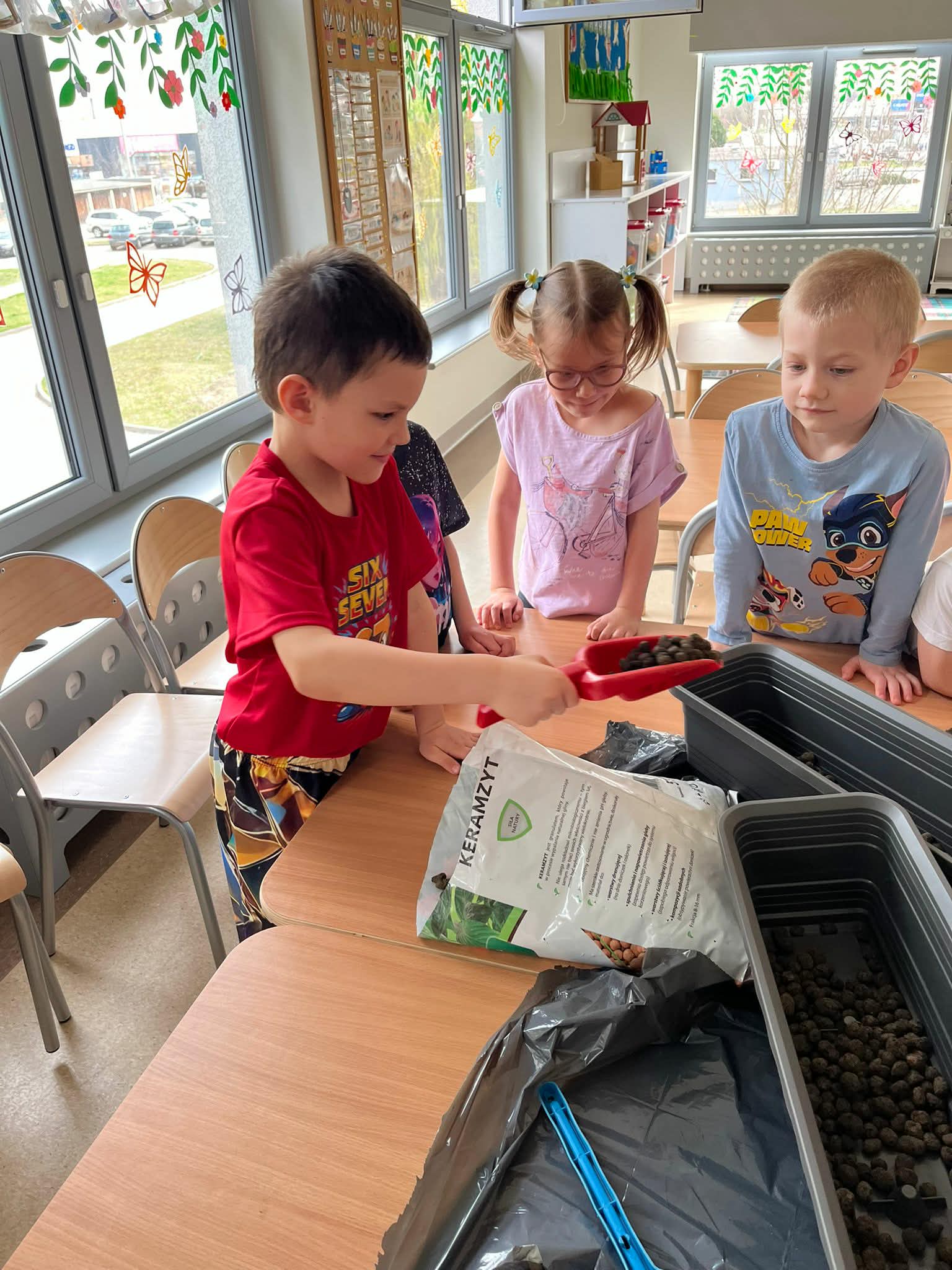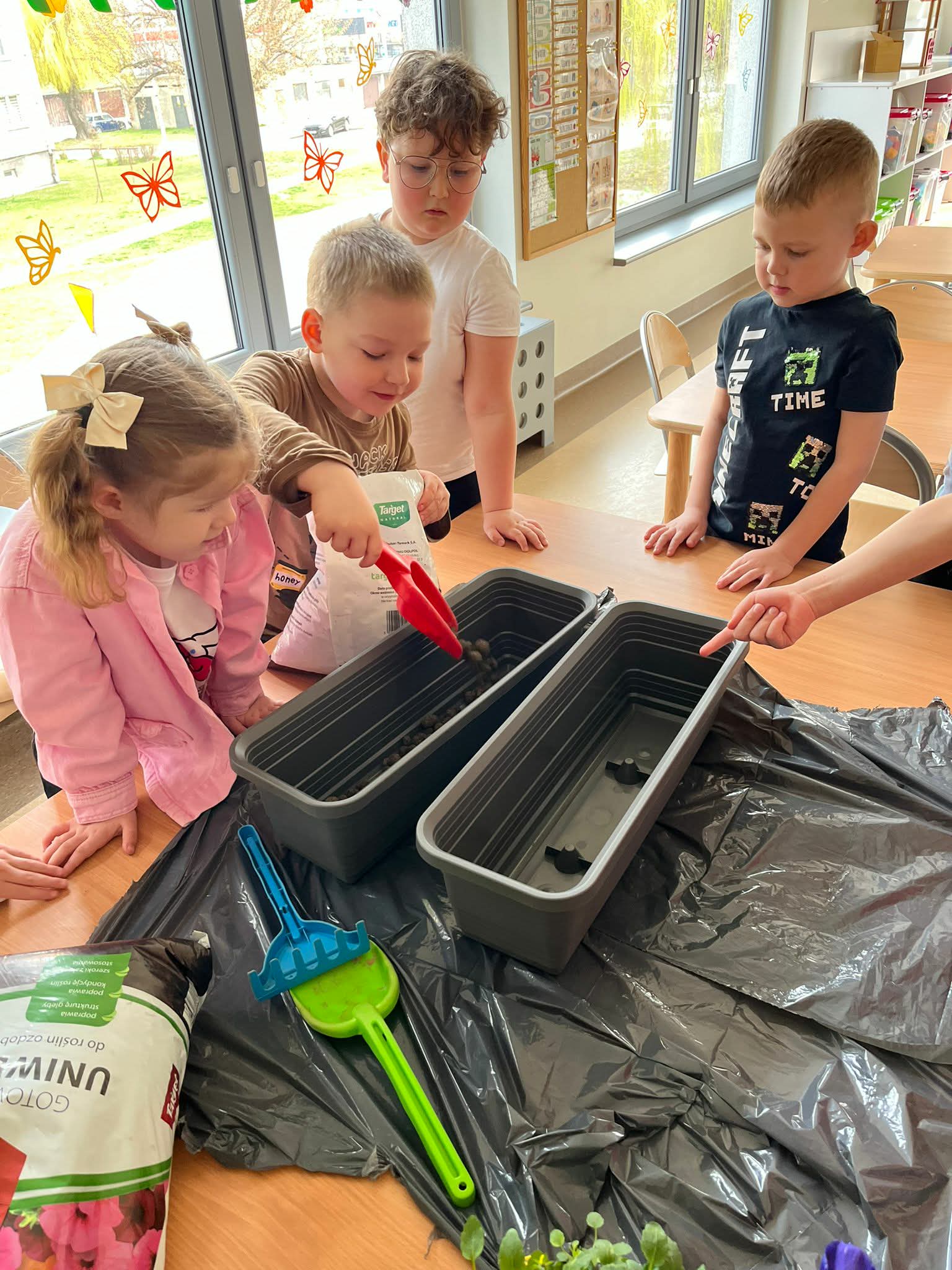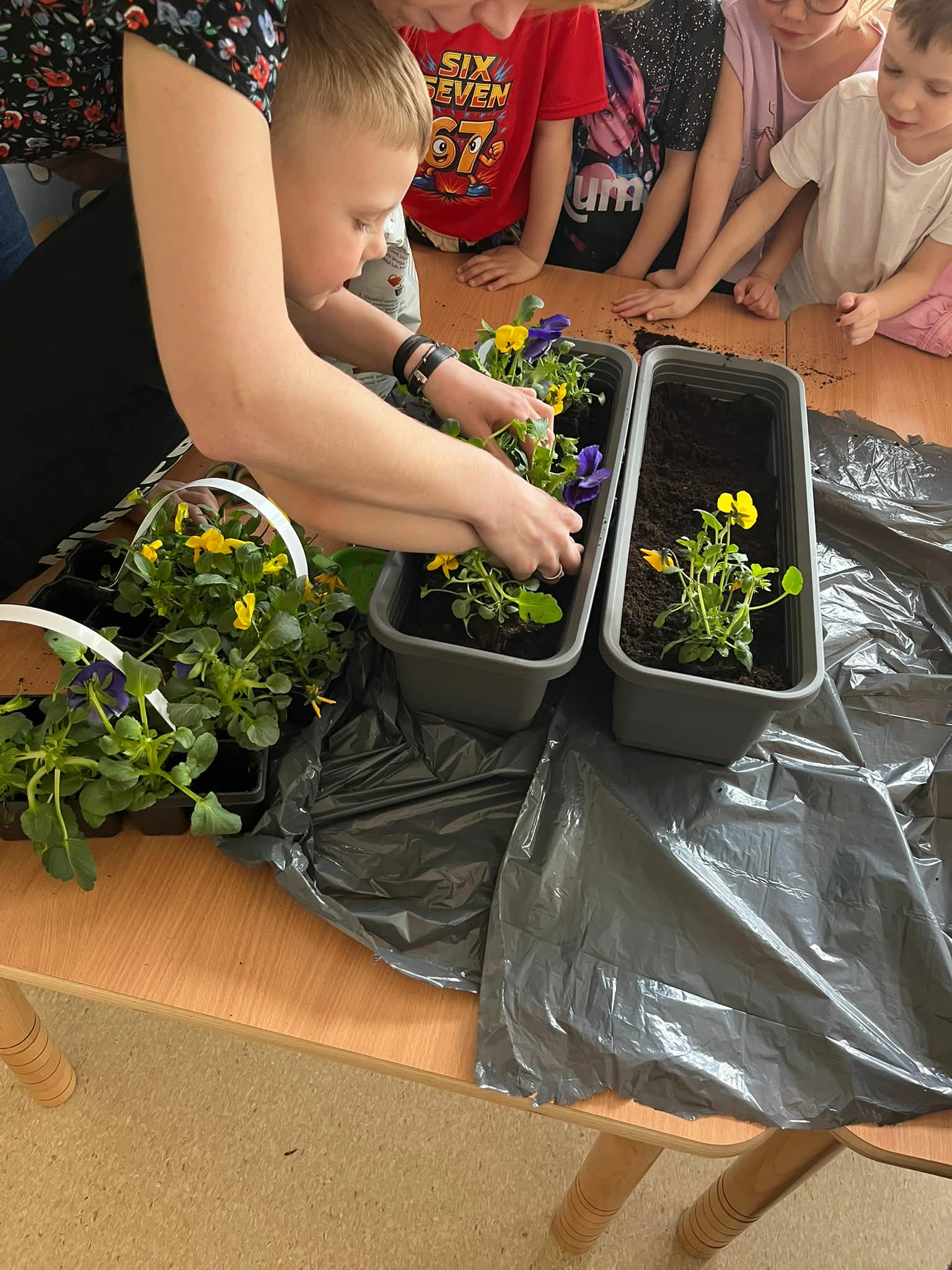 Tym razem grupa Żuczków zamieniła się w prawdziwych ogrodników. Dzieci zapoznały się z czynnikami niezbędnymi roślinom do życia i wzięły się do pracy. Posadziliśmy bratki jak i fasolę, której wzrost będziemy obserwować na każdym etapie .