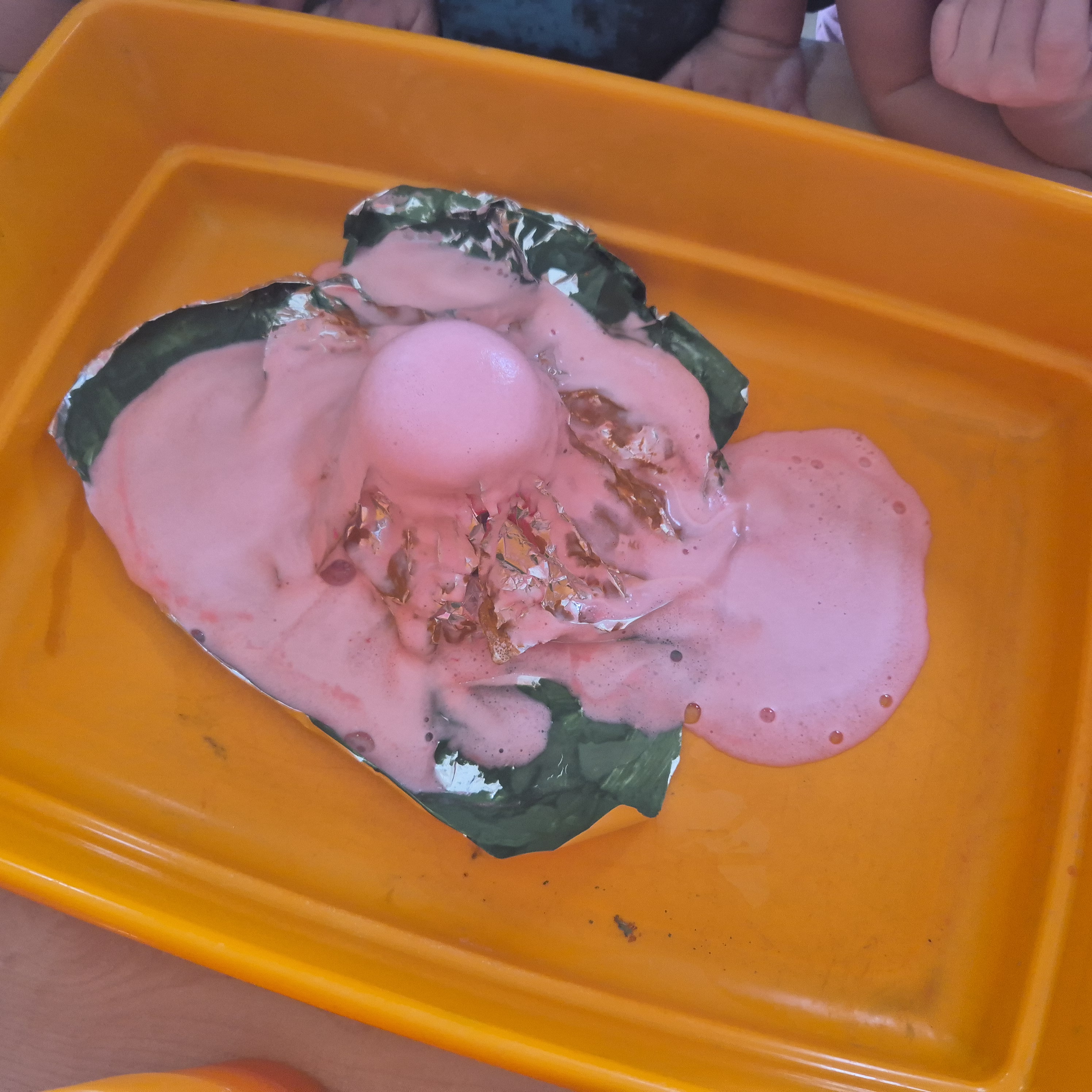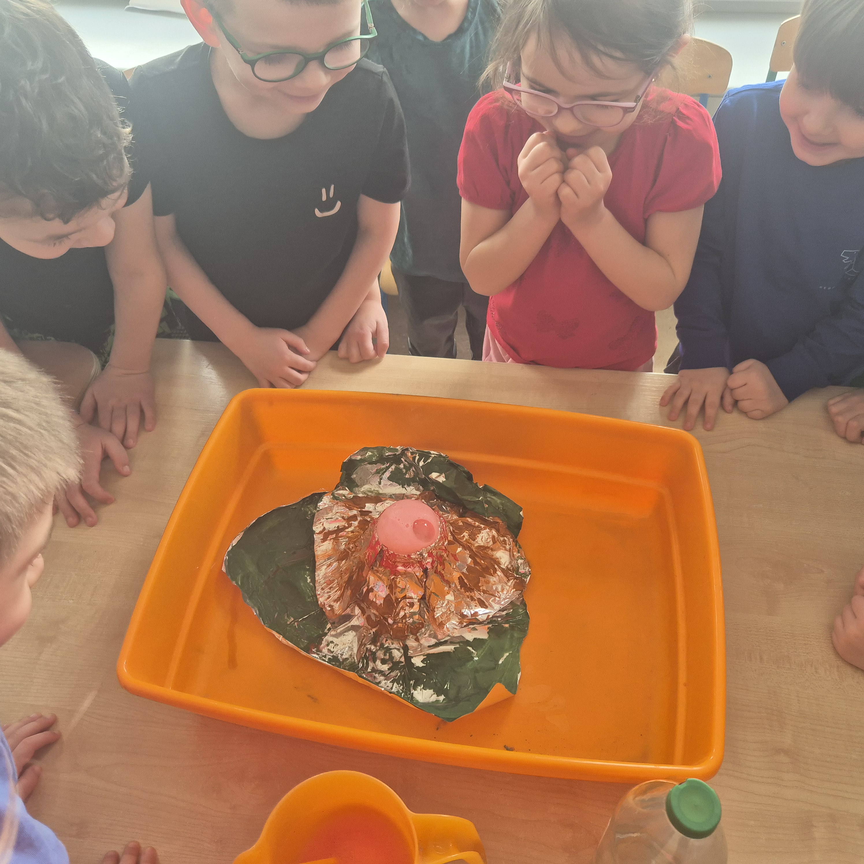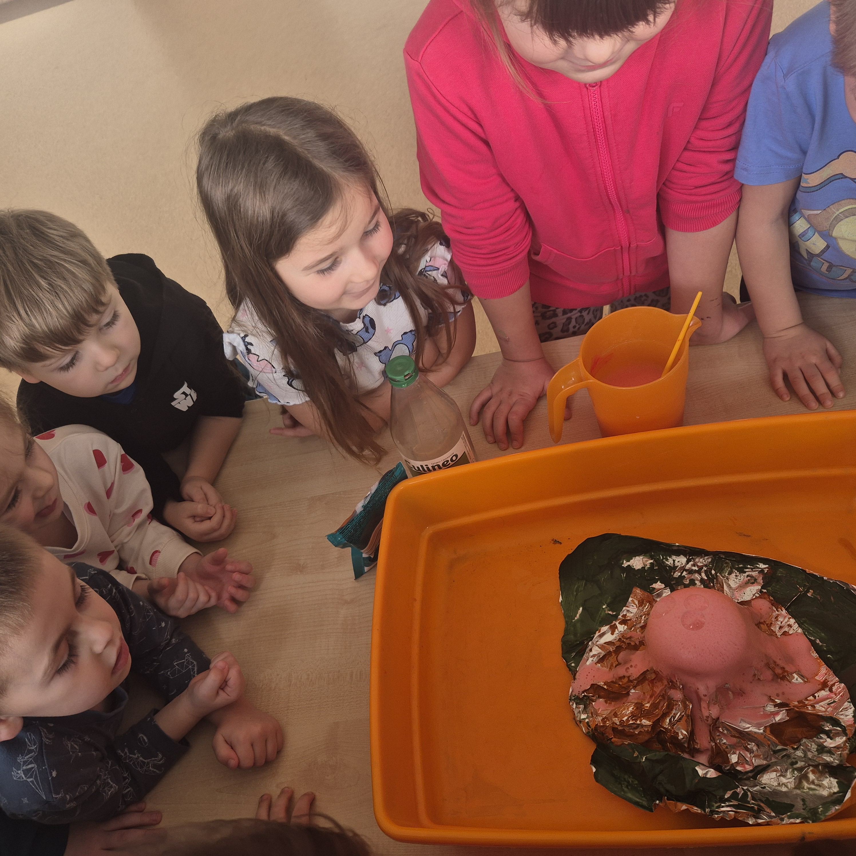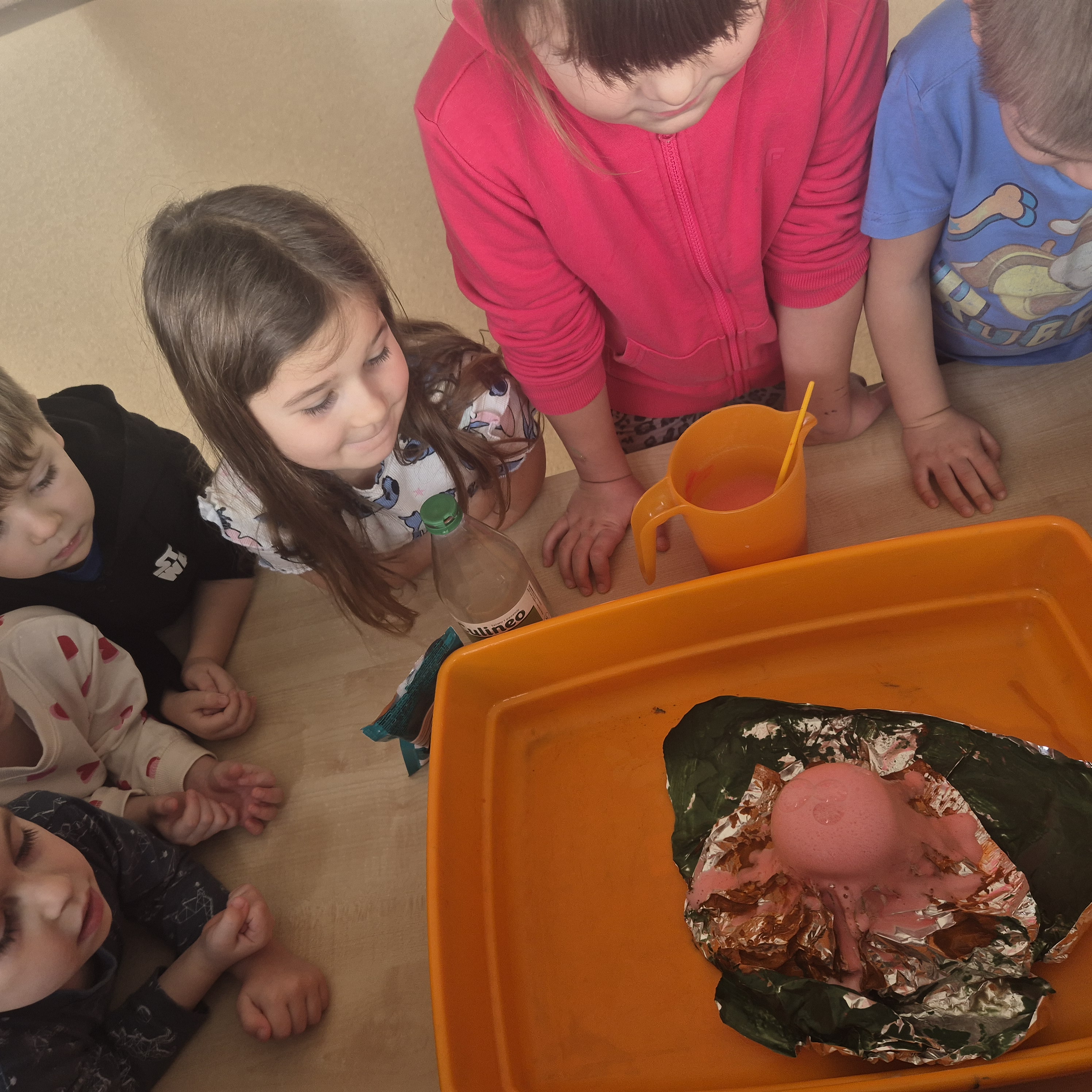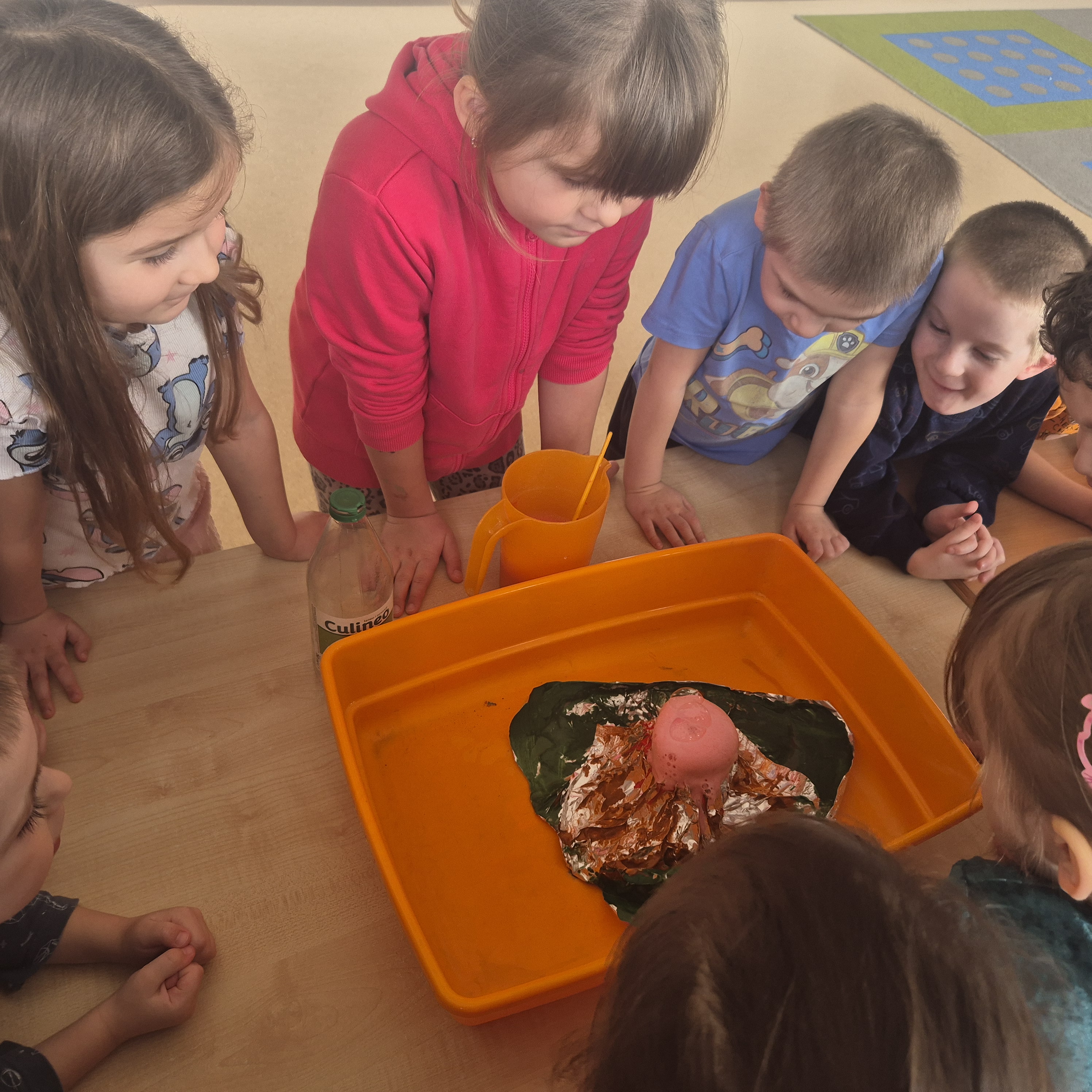 Dzisiaj postanowiliśmy zrobić wulkan. Za pomocą octu, płynu do naczyń, sody oczyszczonej i wody mogliśmy zaobserwować jak wygląda wulkan. Zrobiło to na nas ogromne wrażenie i wzbudziło ciekawość.