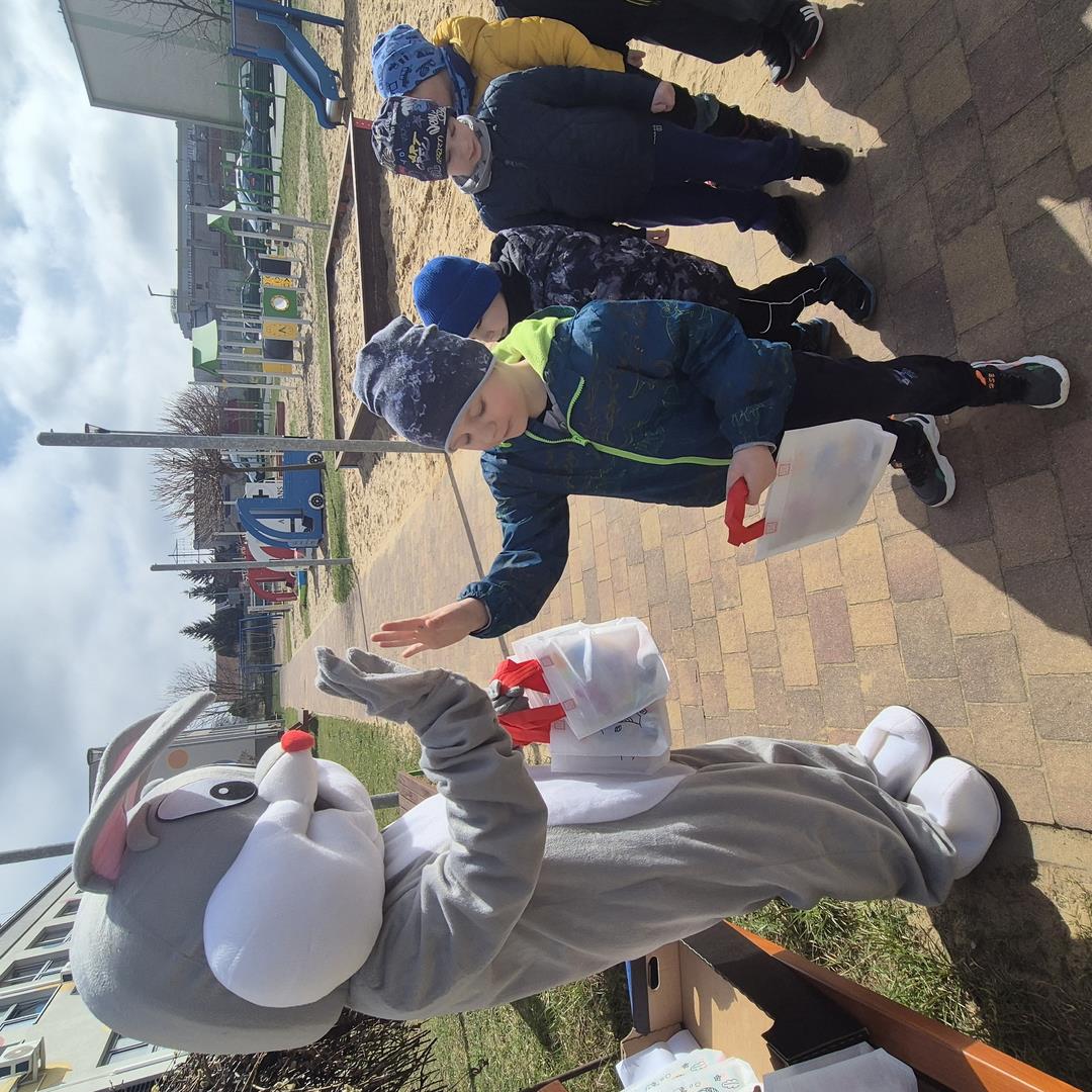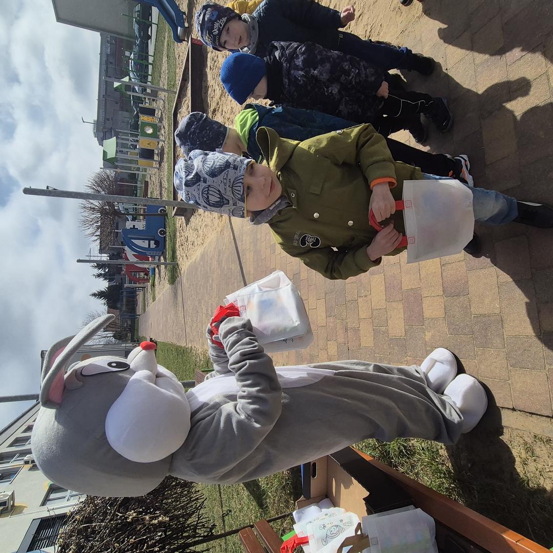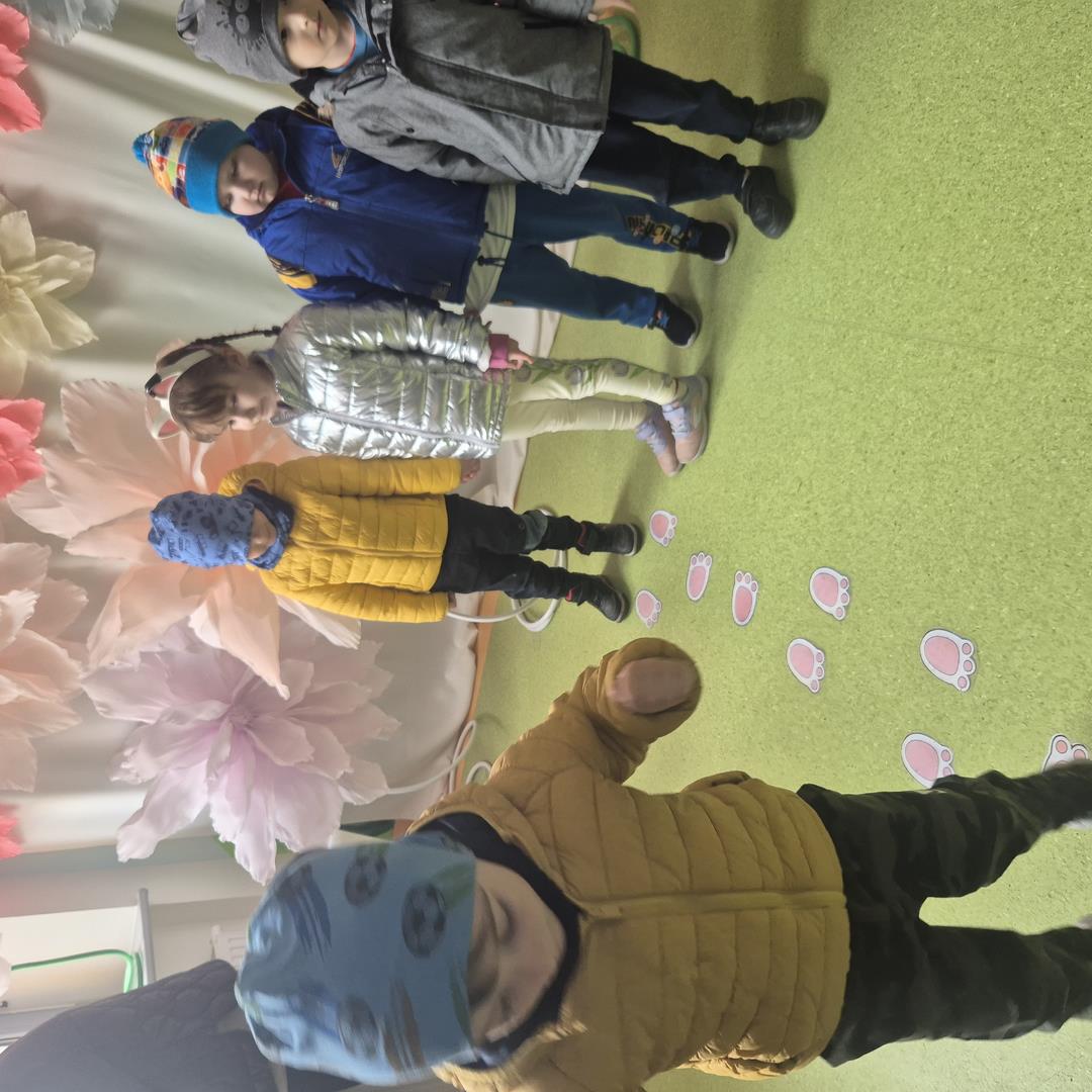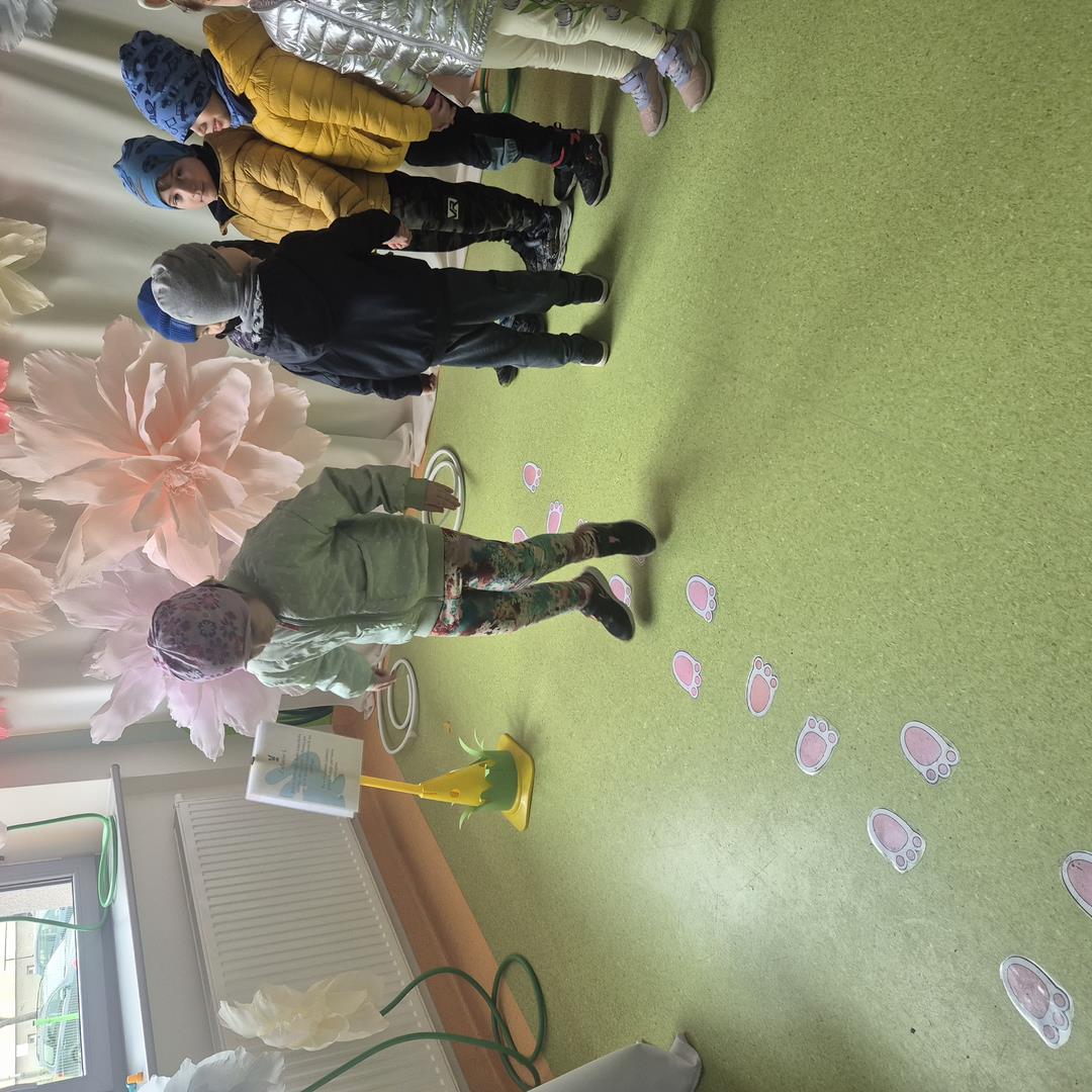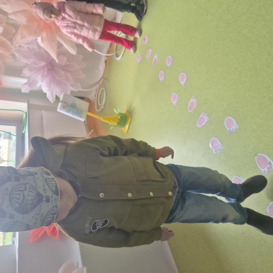 W środę przedświąteczną mieliśmy dzień atrakcji. Rozpoczęliśmy śniadankiem wielkanocnym, malowaliśmy farbami, a następnie poszukiwaliśmy zajączka. Było wesoło, ponieważ najpierw musieliśmy przejść zadania: rozwiązywaliśmy zagadki, zbieraliśmy jajeczka, przyklejaliśmy futerko zajączkowi czy graliśmy w kręgle.. Nie było łatwo, ale cała grupa spisała się bardzo dobrze i dotarliśmy do mety gdzie czekała na nas nagroda spotkanie z Zajączkiem. Wspólnie zatańczyliśmy i otrzymaliśmy po upominku. Zapraszam do galerii:)