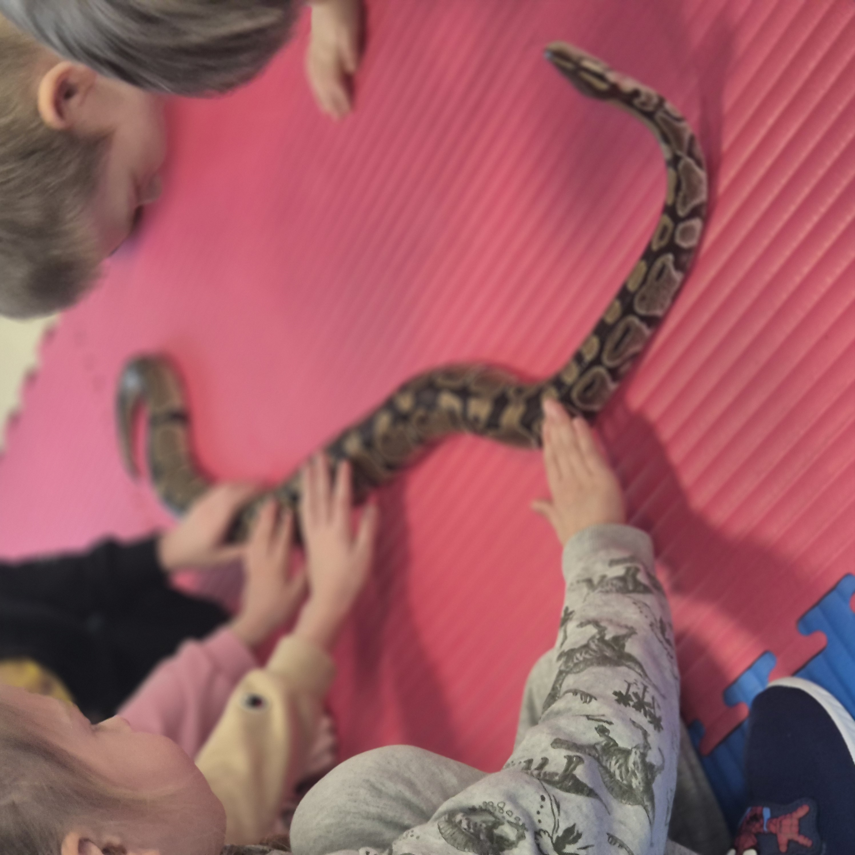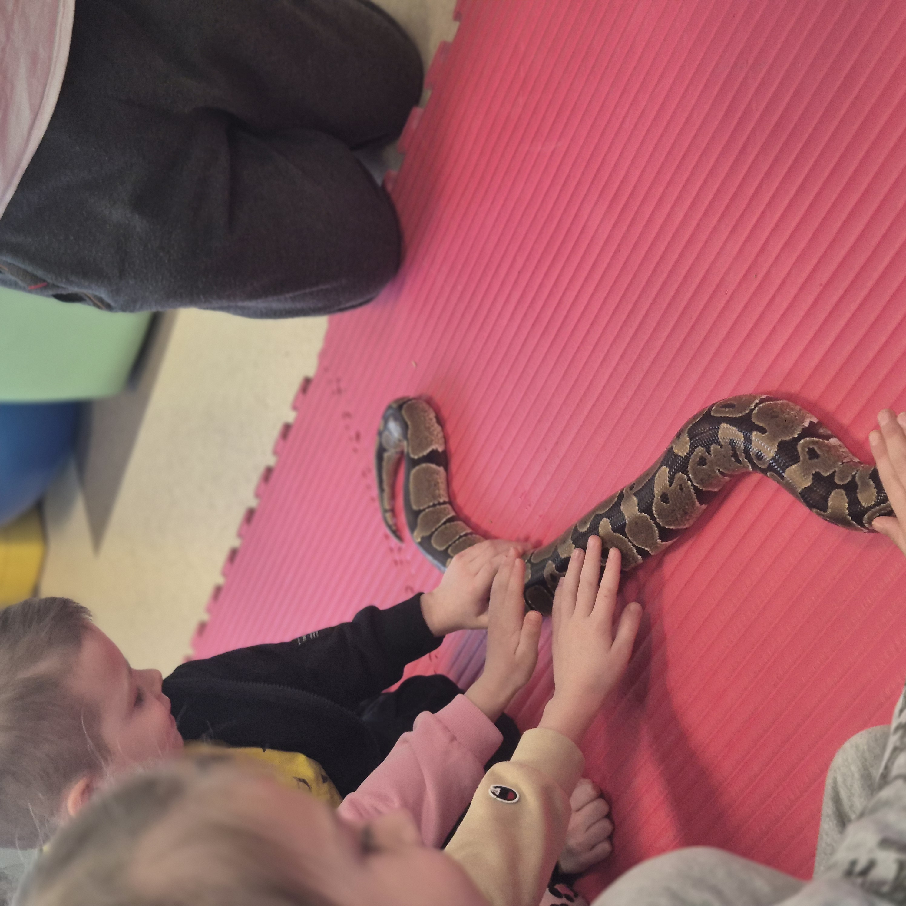 Dziś w przedszkolu dzieci miały okazję spotkać się ze zwierzętami egzotycznymi m. in z wężem, jaszczurką, gekonem, był również żółw oraz królik. Obcowanie ze zwierzętami uczy dzieci empatii oraz nabywania nowej wiedzy.